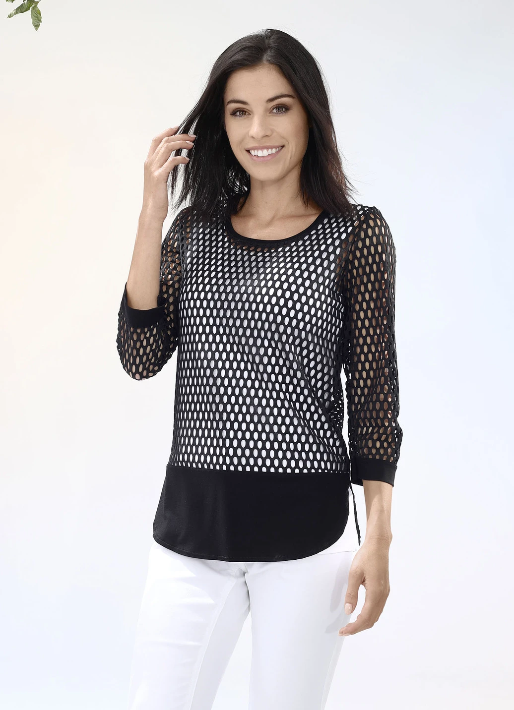 Set, 2-teilig bestehend aus einem schwarzen Netzshirt mit schwarzem Abschluss an den 3/4-langen Ärmeln, abgerundetem Saumabschluss mit Seitenschlitzen und vorderer, schwarzer angesetzter Blende sowie einem Trägershirt in Weiß.