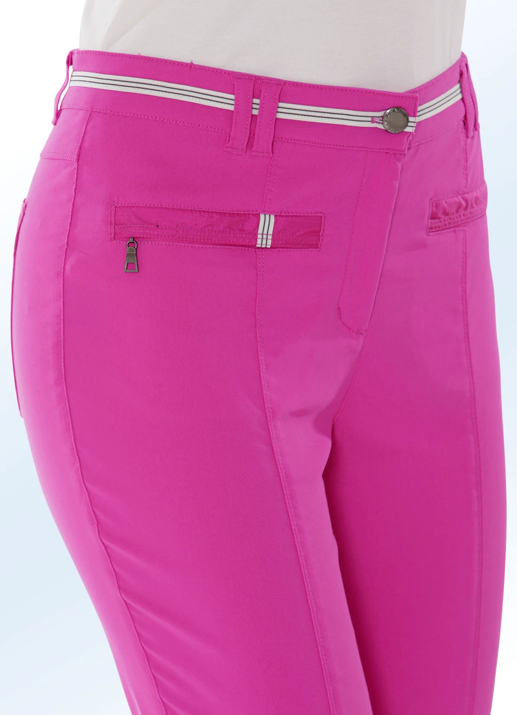 Mit sportivem Chic präsentiert sich diese aufwendig gearbeitete, hochelastische 7/8-lange Hose: elastischer Bund mit dekorativem, kontrastfarbenem Zierband, Gürtelschlaufen, Knopf- und Reißverschluss, paspelierte Seitentaschen mit Reißverschluss und Zieranhänger, Gesäßtaschen, Passe im Rückteil, figurgünstige, abgesteppte Teilungsnähte im Vorder- und Rückteil sowie dekorativer, weitenverstellbarer Riegel seitlich an den Beinabschlüssen. Innenbeinlänge ca. 62 cm.