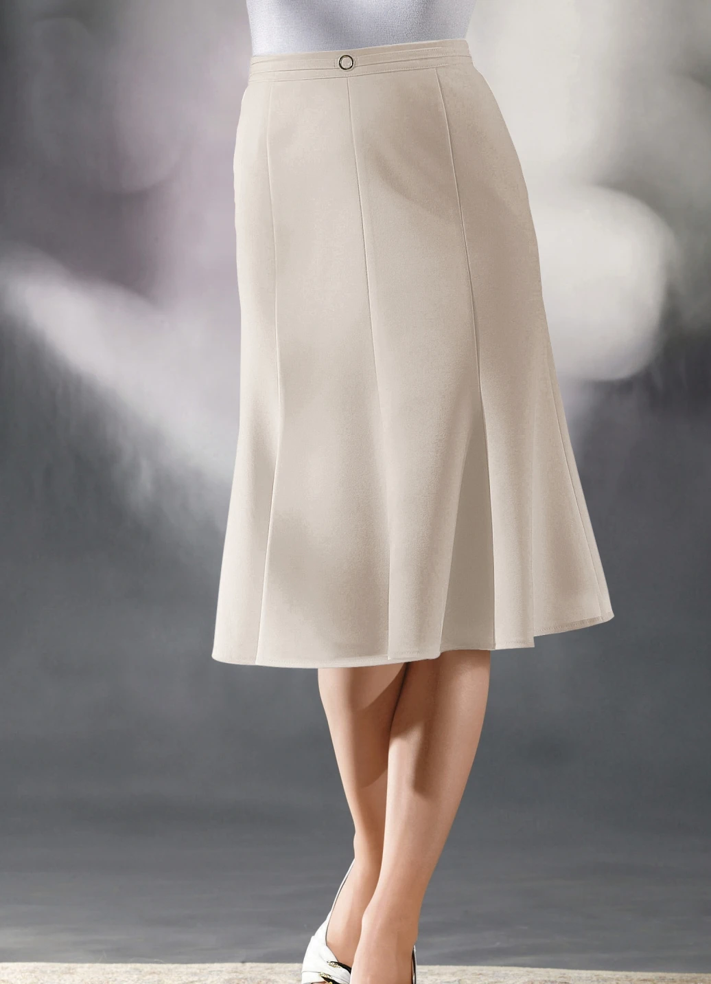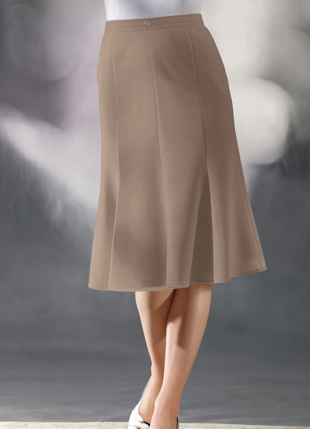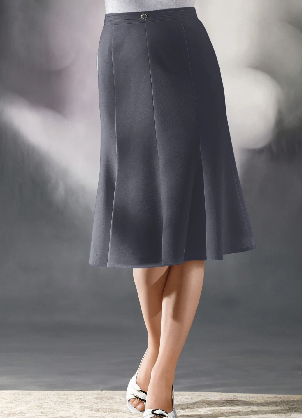 Ansprechender, schön ausgestellter, langer 8-Bahnenrock: Zierband und Zierteil vorne am Bund, rückwärtige Dehnbundeinsätze sowie hinterer Nahtreißverschluss. Länge ab Taille ca. 68 cm, bei K-Gr. ca. 64 cm.