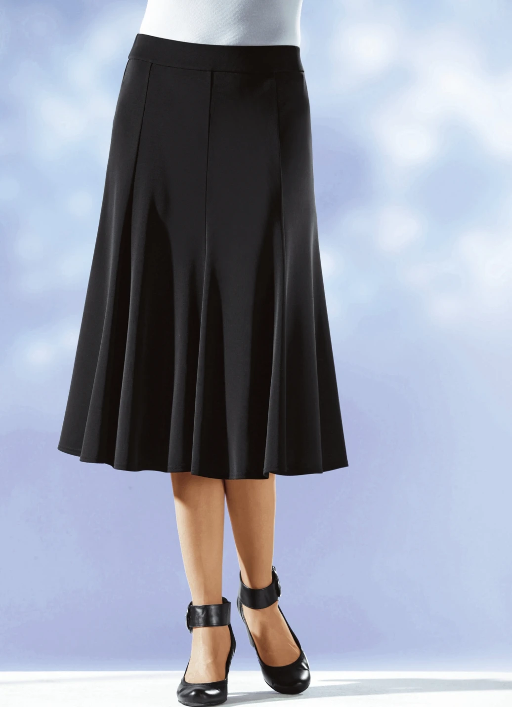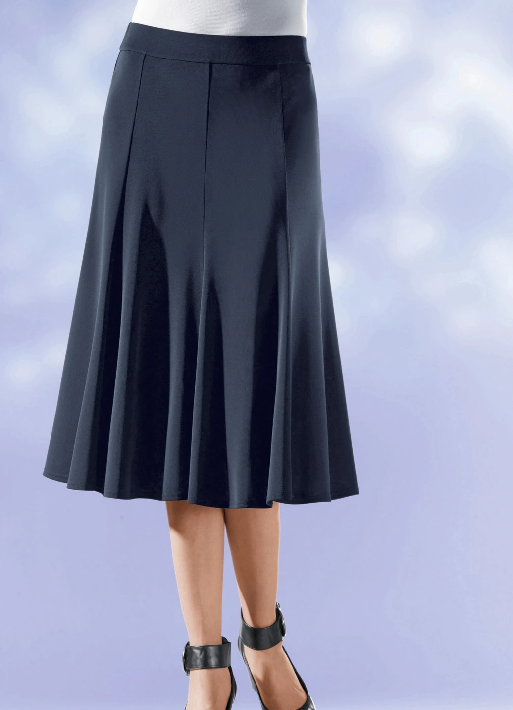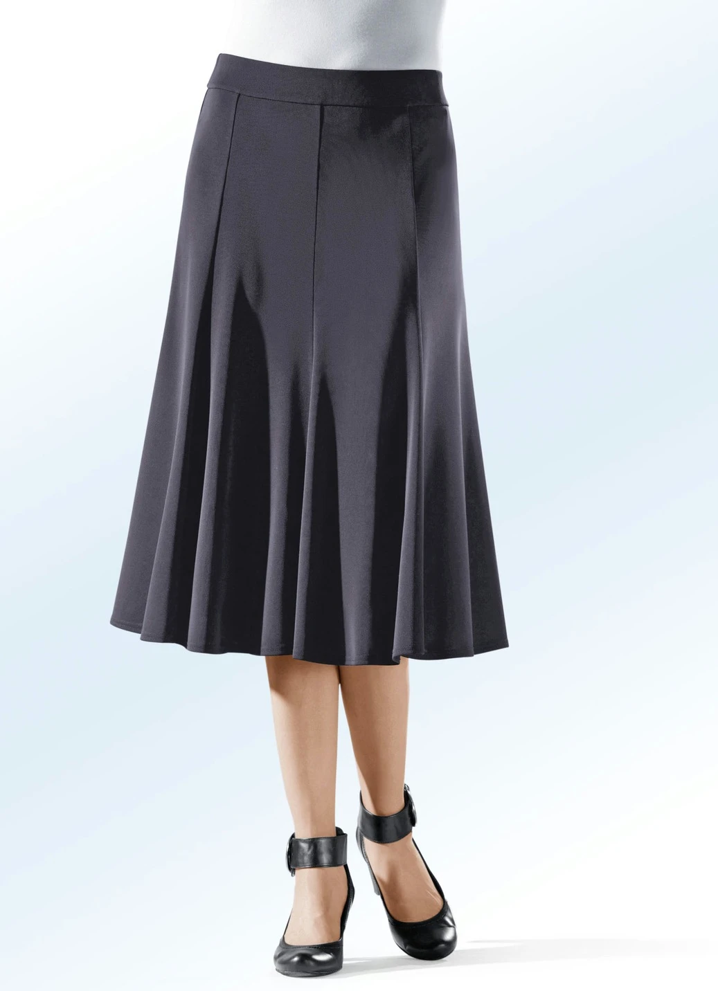 Exzellenter, weich fließender langer 8-Bahnenrock in komfortabler Schlupfform, glatt anliegend dank des innenliegenden, unsichtbaren Rundum-Dehnbundes, mit glockig schwingendem Saumabschluss. Länge ab Taille ca. 72 cm, bei K-Gr. ca. 68 cm.