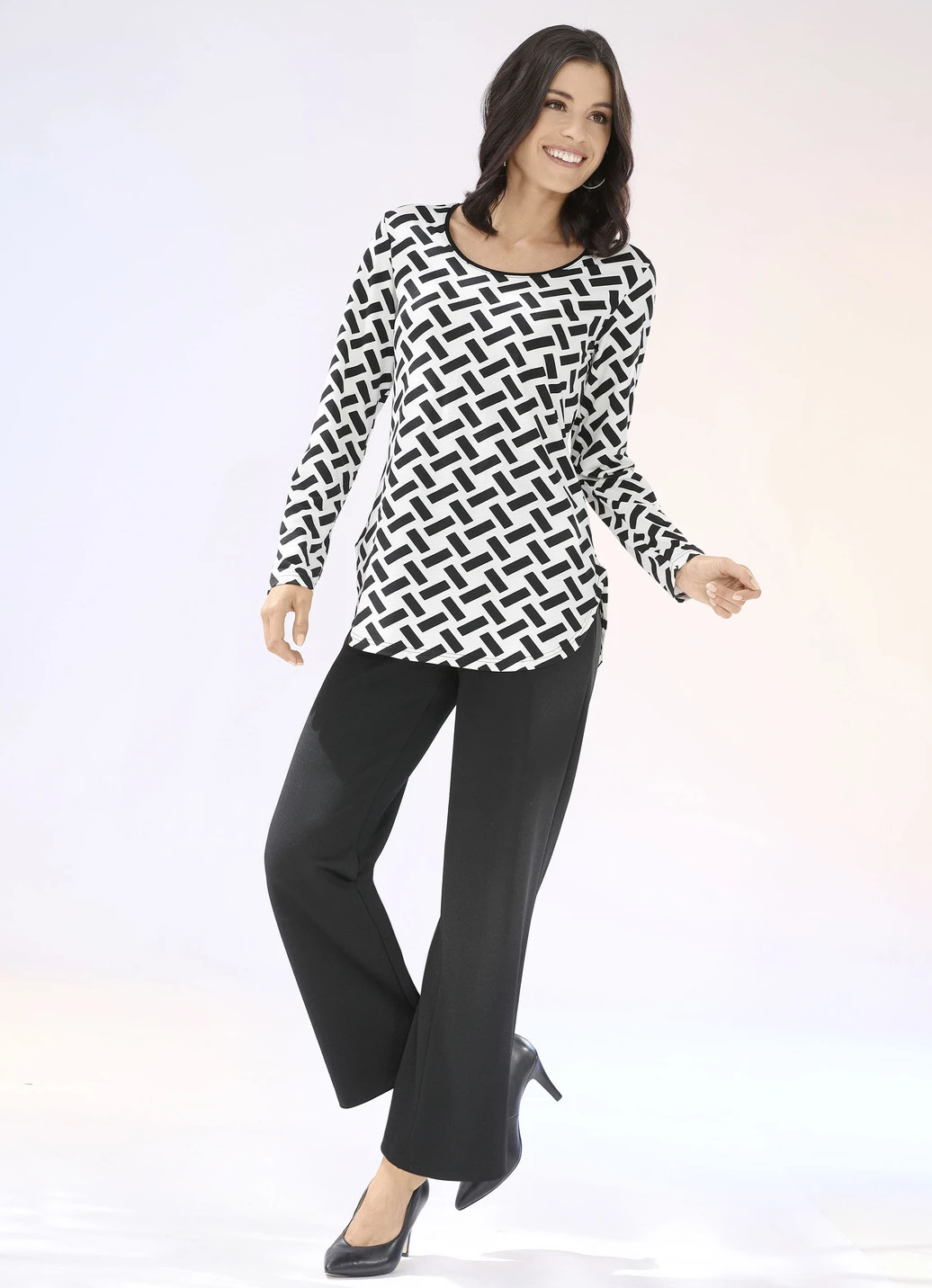 Außergewöhnliches Shirt in Ecru-Schwarz allover, mit seitlich abgerundetem Saumabschluss.