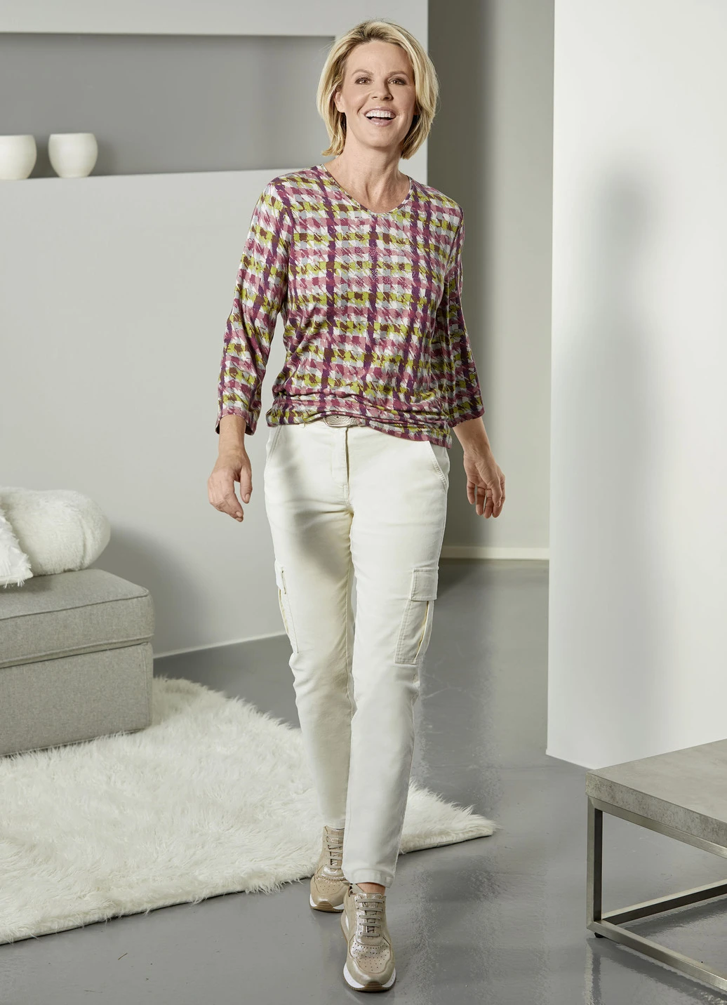 Jedes Teil ein Unikat! Ansprechendes Shirt in Kiwi-Bordeaux-Grau-Bunt allover, mit Plättchenzier im Vorderteil sowie 3/4-langen Ärmeln.