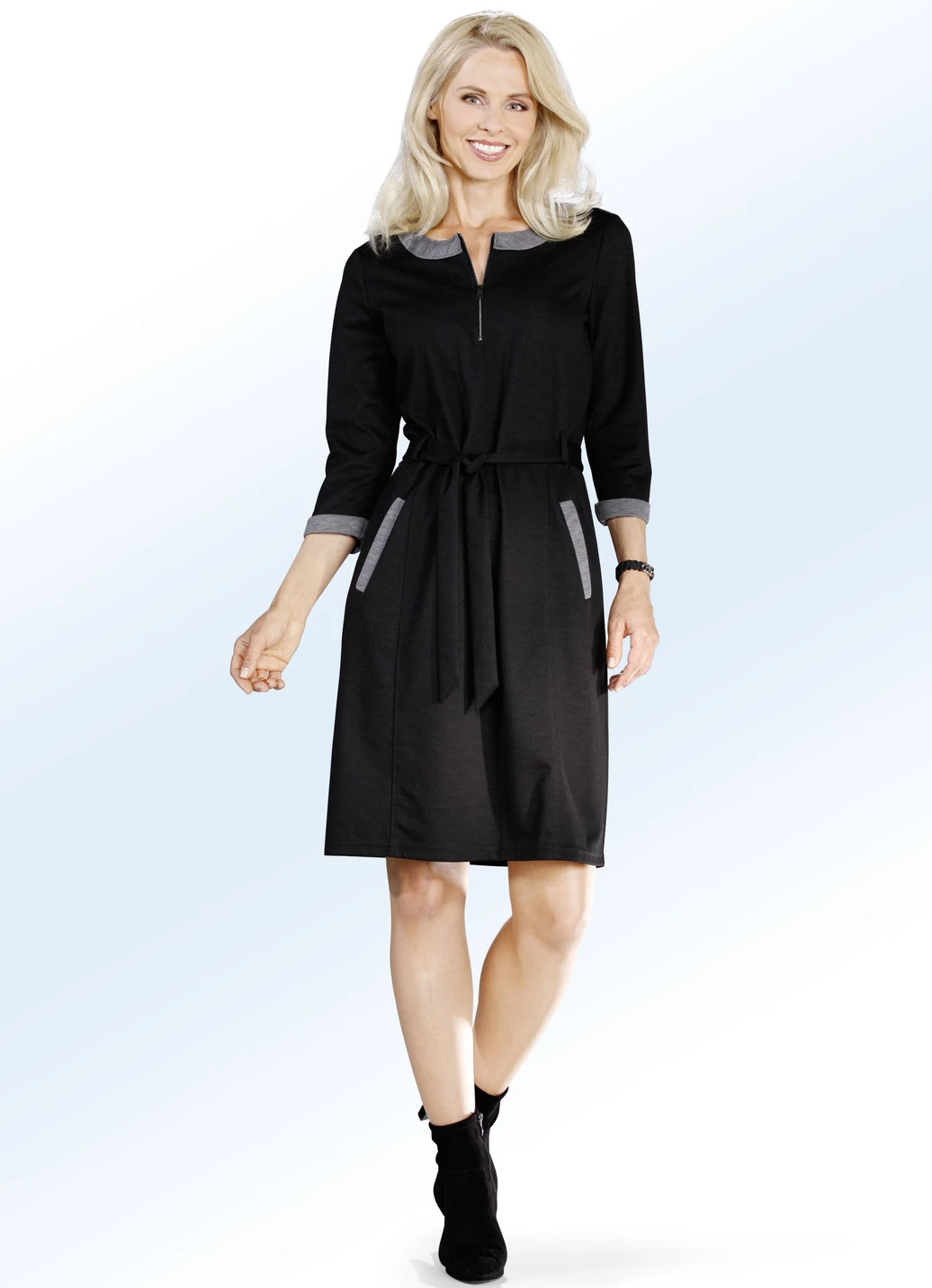 Attraktives, schwarzes Kleid in Schlupfform, mit grauem Besatz am runden Halsausschnitt, am Umschlag der 3/4-langen Ärmeln und an den zwei Einschubtaschen sowie Gürtelschlaufen und Bindeband.