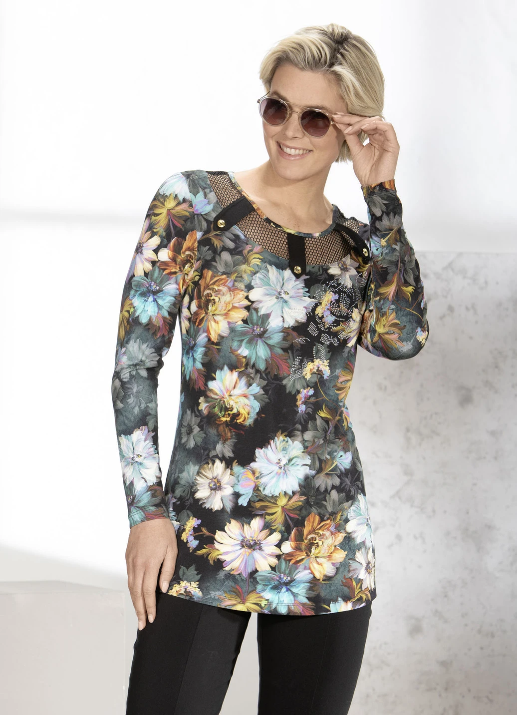 Ausdrucksvolles Longshirt mit farbbrillantem Inkjet-Druck in Schwarz-Bunt allover, runder Halsausschnitt mit Netz-Jersey-Blende, Zierlaschen und -knöpfe sowie Strasszier im Vorderteil.