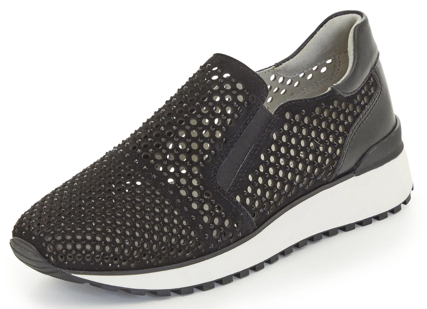 Luftig perforierter, mit Glitzersteinchen versetzter Slipper aus Velours- und Nappaleder: in Weite G, seitlich eingesetzte Gummizüge, Futter, herausnehmbares Lederfußbett, leichte TPR-Profilsohle sowie 25 mm Keilabsatz