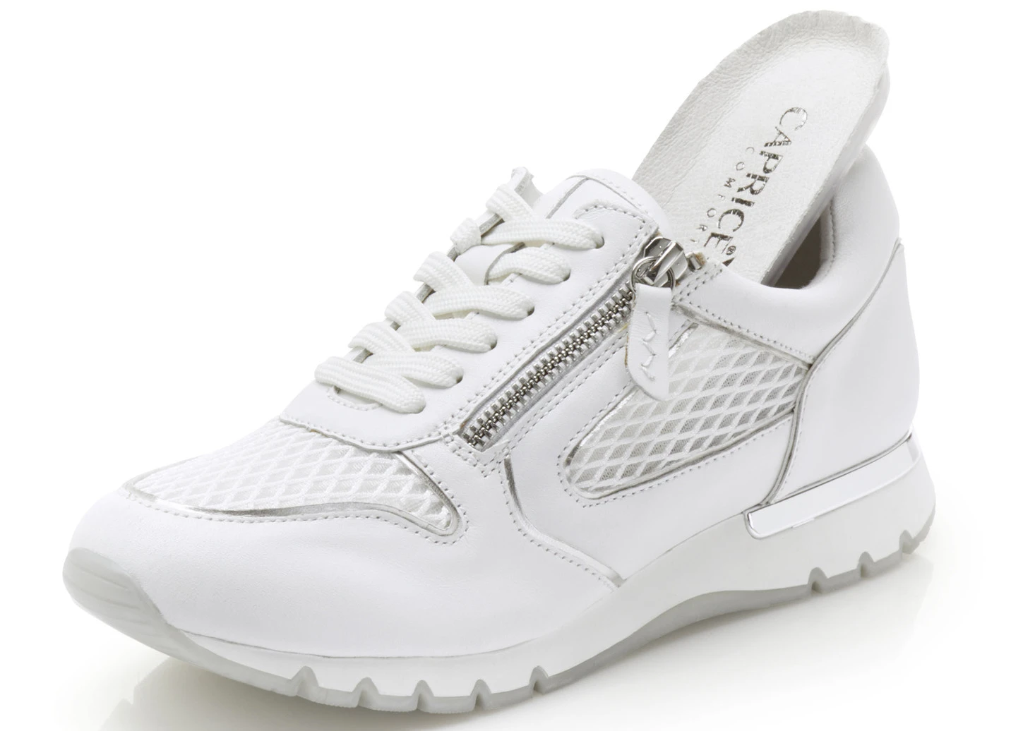 Sneaker aus luftigem Textilmaterial und zart glänzendem Veloursleder, in Weiß mit Nappaleder kombiniert: in Weite H, mit silberfarbenen Einsätzen, Schnürung und seitlichem Reißverschluss, Futter, herausnehmbarem Lederfußbett, leichter TPR-Profilsohle sowie 15 mm Keilabsatz