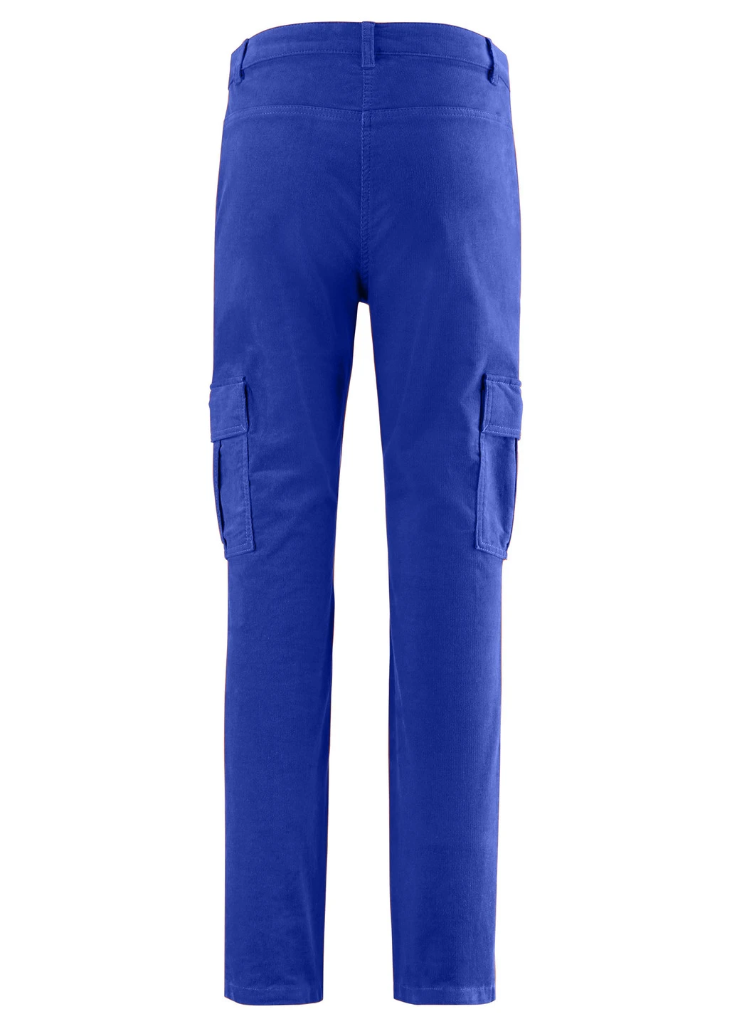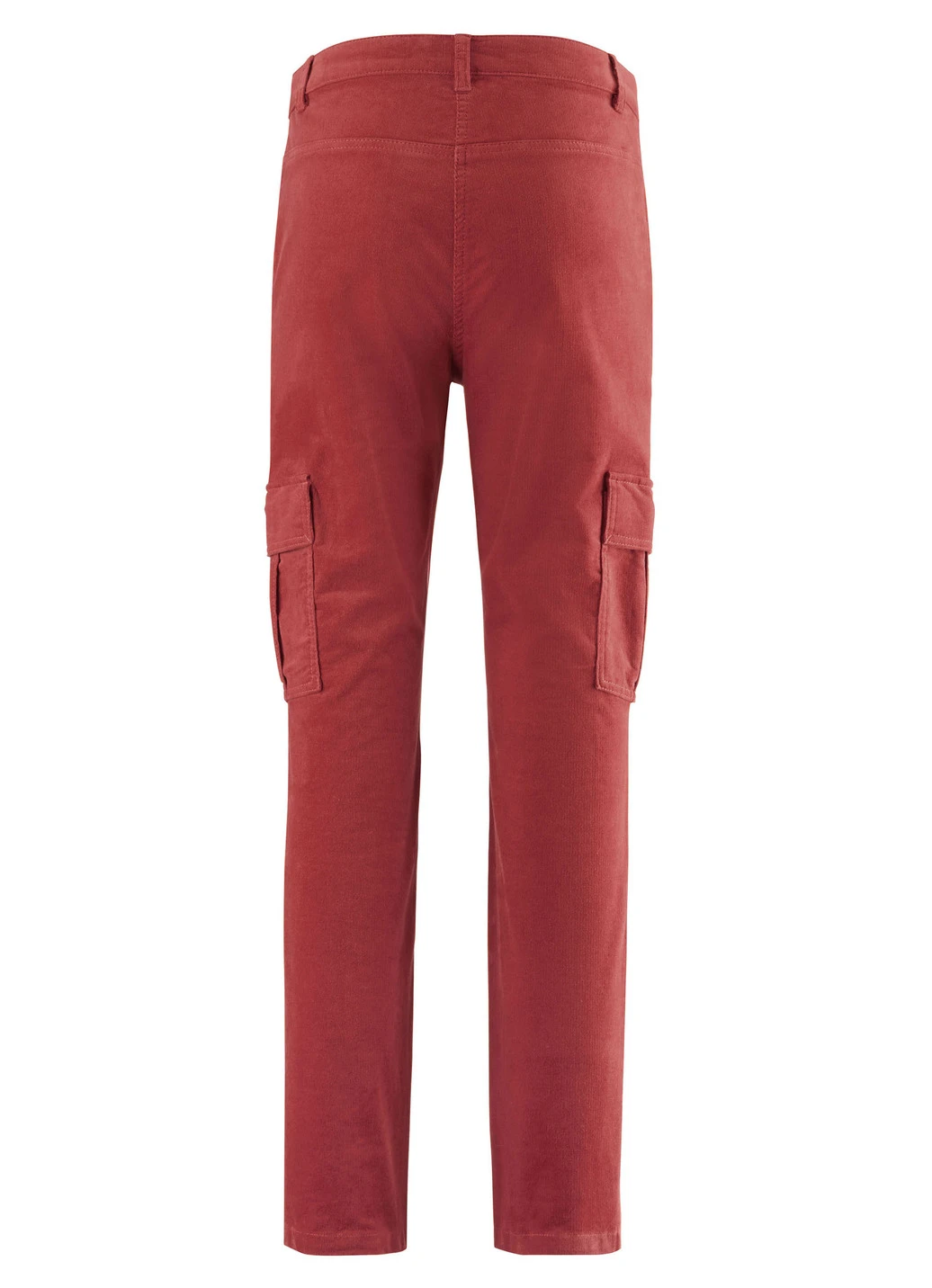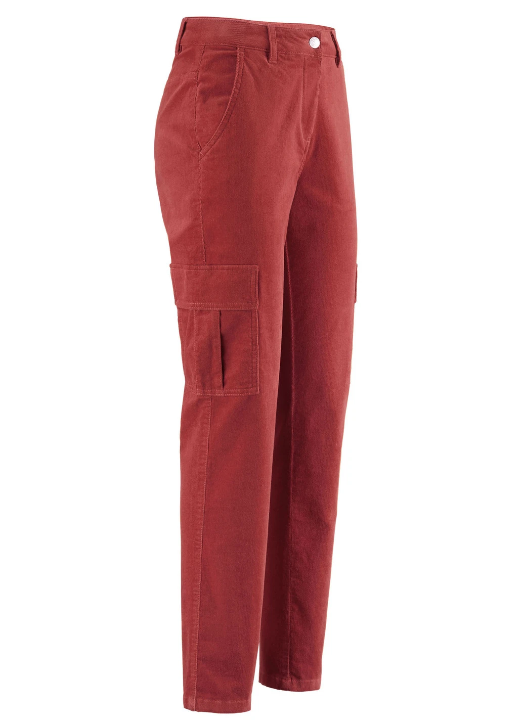 Angesagte, knöchellange Cord-Cargohose: elastischer Formbund, Gürtelschlaufen, Knopf- und Reißverschluss, Seitentaschen, aufgesetzte Pattentaschen sowie figurformende Passe im Rückteil. Innenbeinlänge ca. 74 cm, Fußweite ab 32 cm.