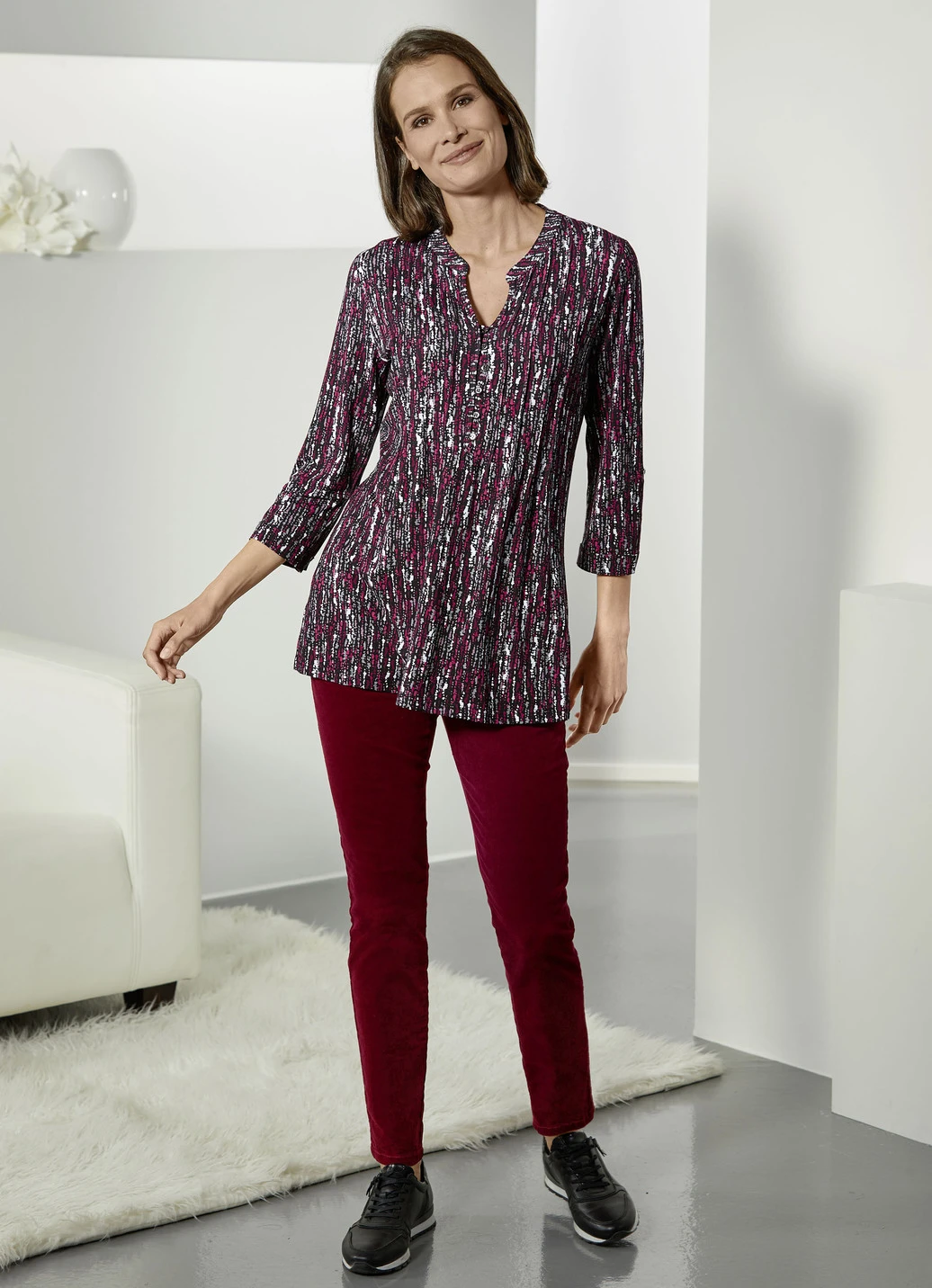 Voll im Trend ist diese angesagte, tragangenehme Cordhose: bequeme Schlupfform, Dehnbund rundum, angedeutete Reißverschluss-Zierblende sowie Seitentaschen. Innenbeinlänge ca. 77 cm, Fußweite ab 30 cm.