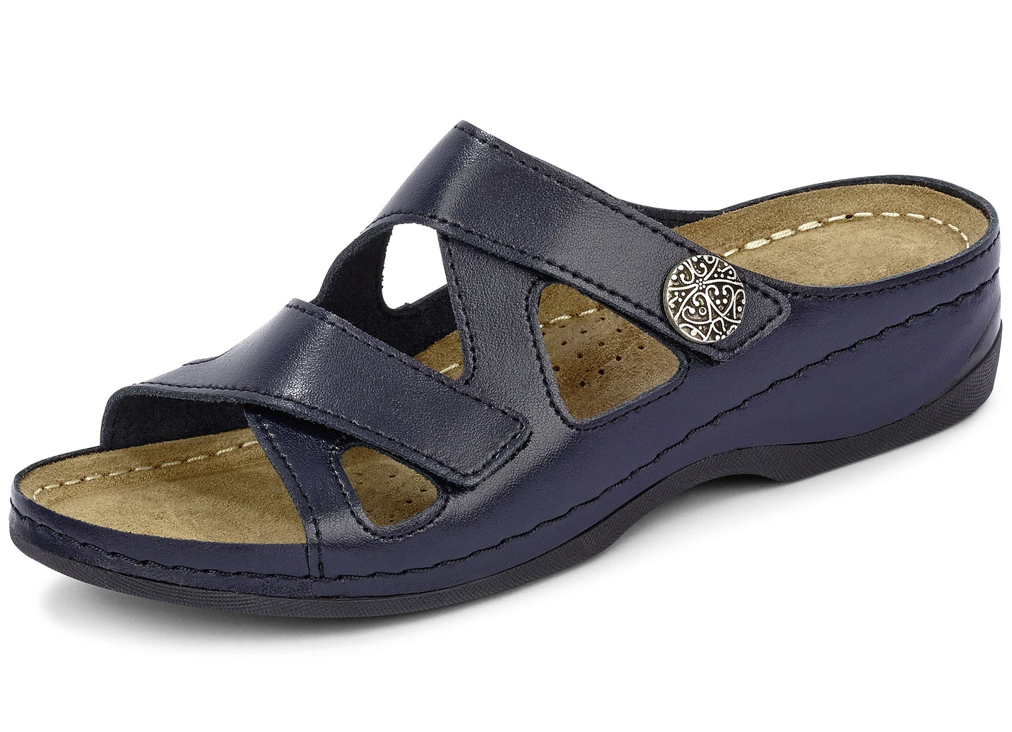 ELENA EDEN-Pantolette aus Rind-Nappaleder: in Weite G, zwei verstellbare Klettspangen, gepolstertes Lederfußbett mit Pelotte und Gelenkstütze, leichte PU-Riffelsohle und 30 mm Keilabsatz