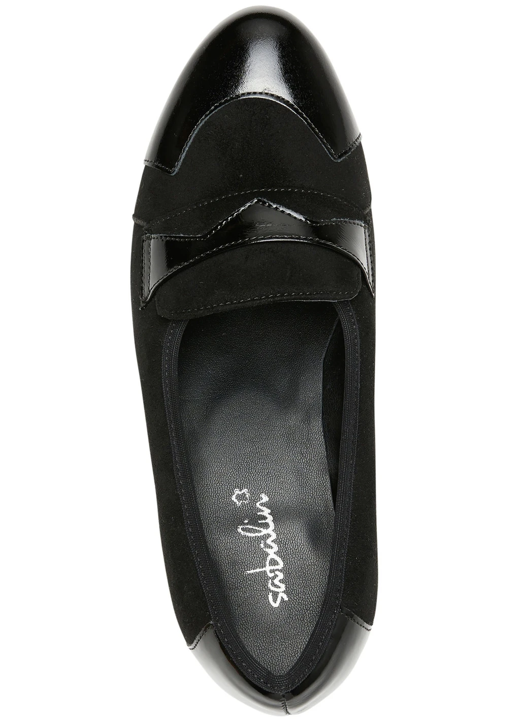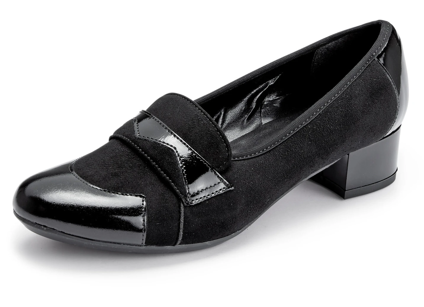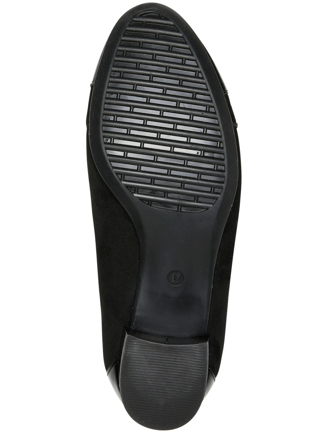 Schwarzer ELENA EDEN-Pumps aus weichem Nubukmaterial und Lack, mit dekorativer Spange: Weite G, Rundum-Gummizug, Futter, Lederdecksohle, PU-Riffelsohle, 30 mm Absatz