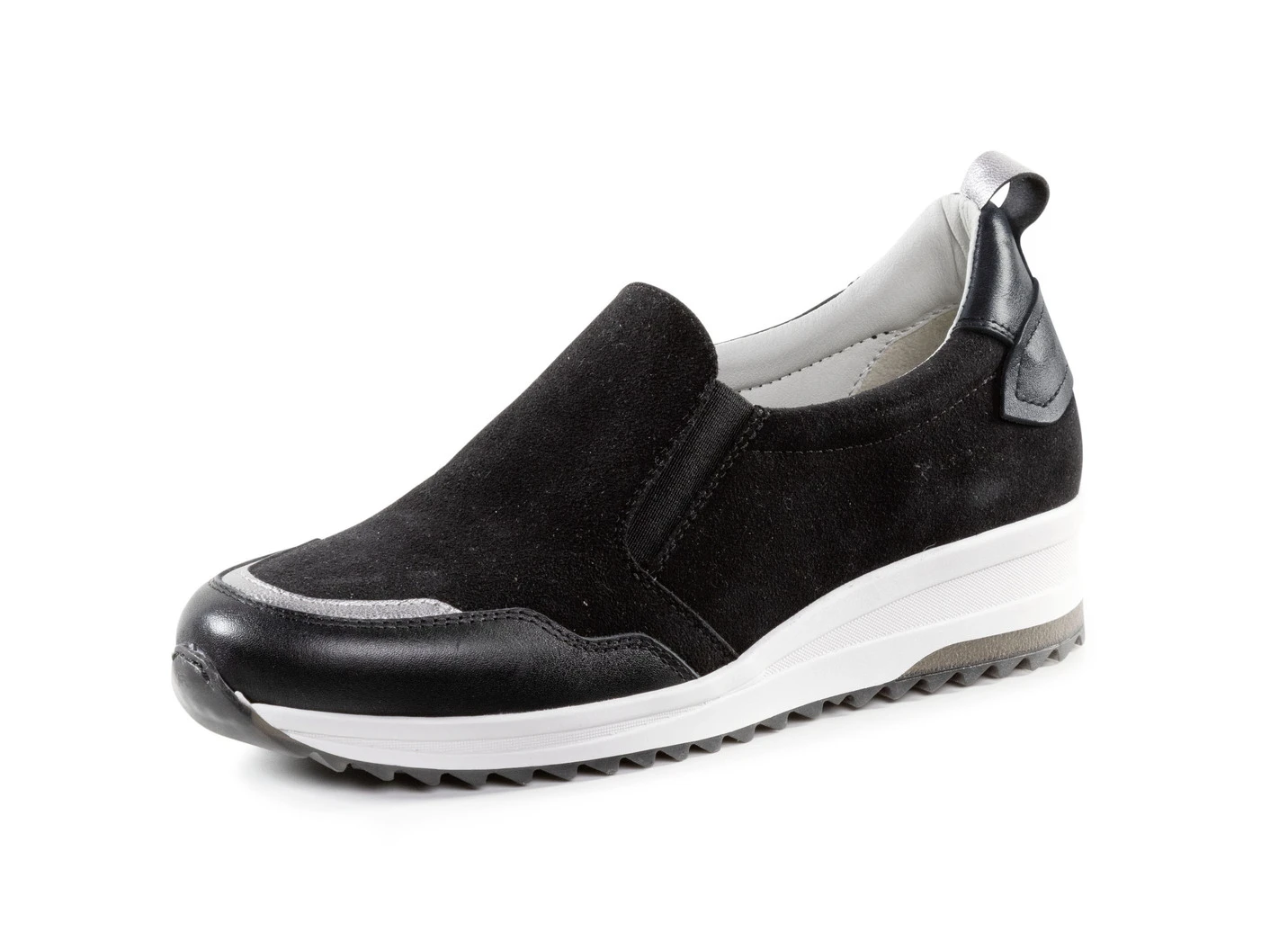 ELENA EDEN-Slipper in Schwarz-Silber aus Veloursleder mit Besätzen aus Nappaleder: Weite H, zwei seitliche Gummizüge, Futter, herausnehmbares Fußbett, leichte TR-Profilsohle sowie 25 mm Keilabsatz