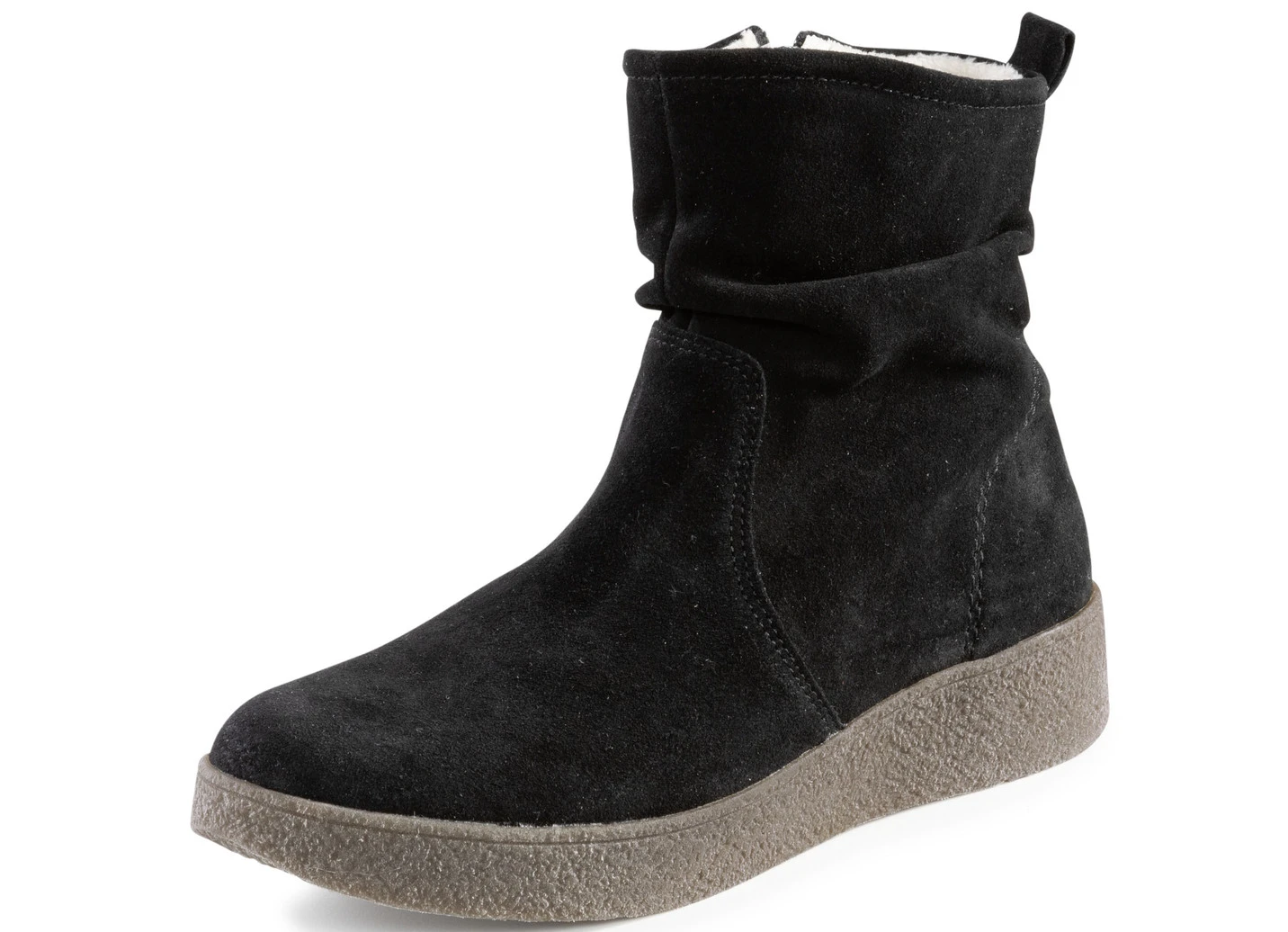 ELENA EDEN-Stiefelette aus weichem Veloursleder: in Weite G, Innenreißverschluss, wärmendes Textilfutter, herausnehmbares Fußbett, TR-Laufsohle sowie 15 mm Keilabsatz. Schafthöhe ca. 16 cm