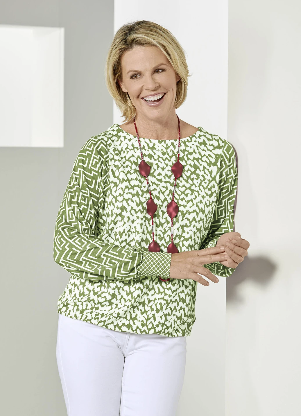 Fabelhaftes Shirt in Muster-Mix allover, mit Manschetten-Abschlüssen an den langen Ärmeln sowie Saumabschluss mit Gummizug.