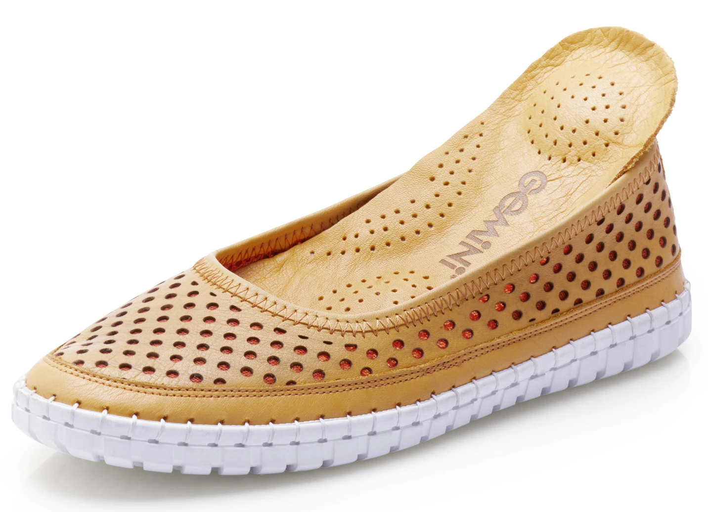 Luftig perforierter Ballerina aus Rind-Nappaleder: in Weite G, leichtes Textilfutter, herausnehmbares Lederfußbett, leichte, handgenähte Gummi-Noppensohle sowie 10 mm Keilabsatz