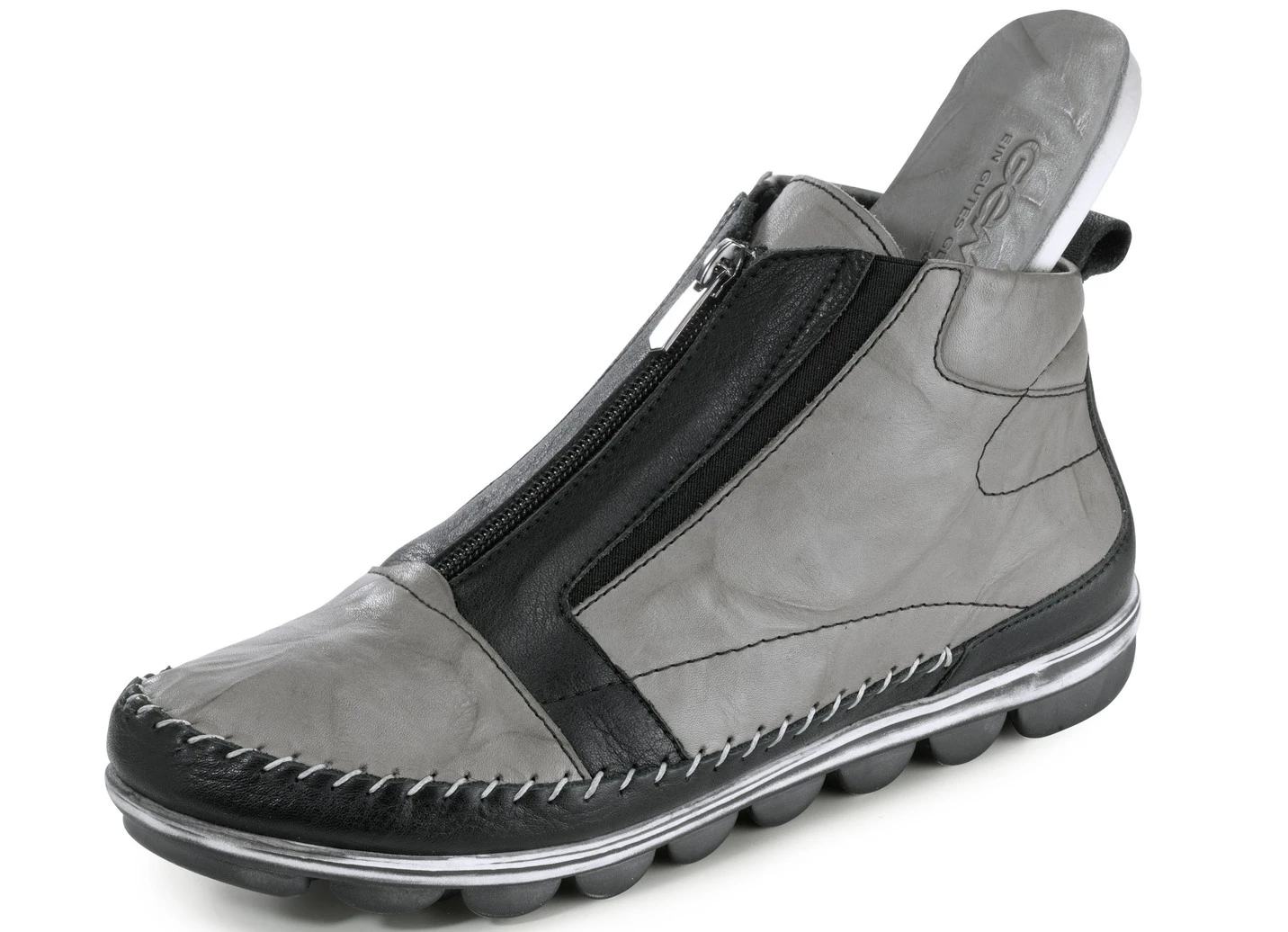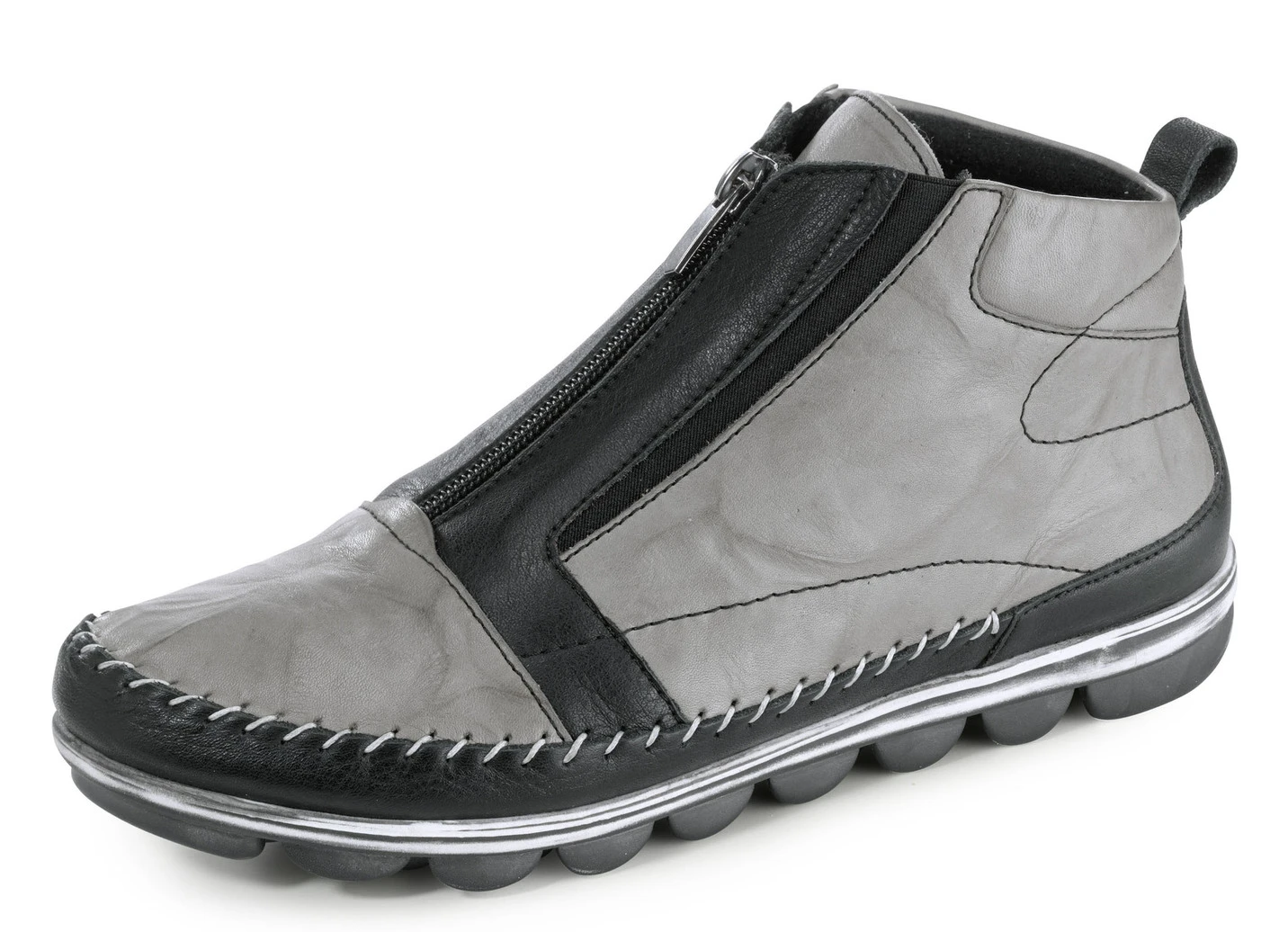 Mokassin-Bootie aus Rind-Nappaleder mit Knitter-Struktur: in Weite G, praktischer Reißverschluss, seitliche Elastikeinsätze, Textilfutter, herausnehmbares Lederfußbett, leichte TR-Profilsohle sowie 15 mm Keilabsatz. Schafthöhe ca. 10 cm