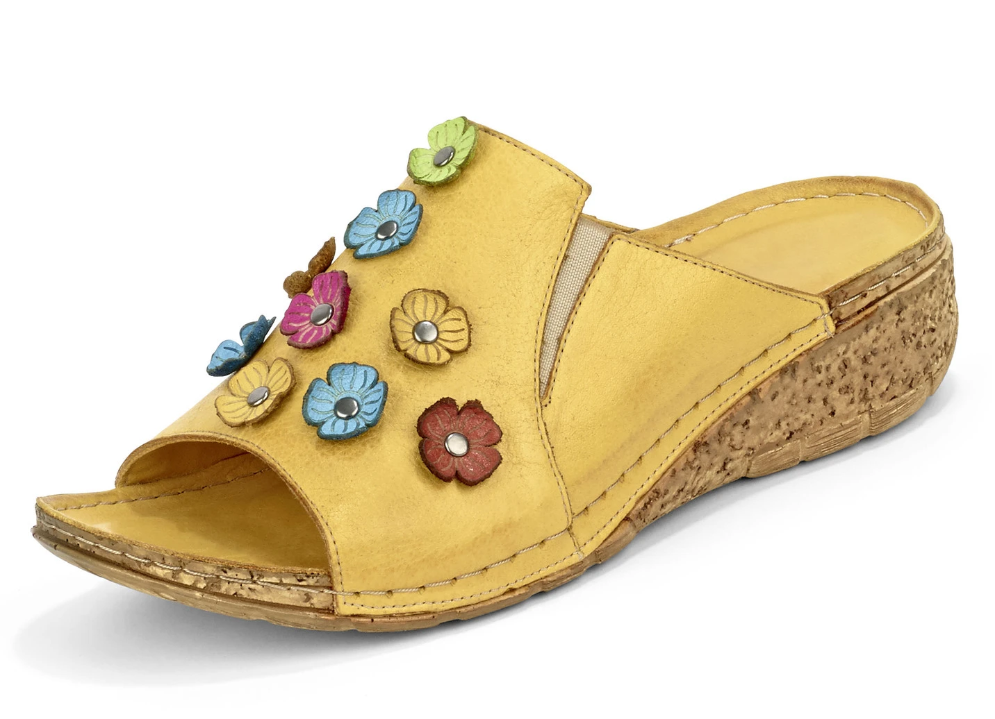 Pantolette aus Nappaleder mit bunten Lederblüten: in Weite G, seitlich eingesetzte Gummizüge, Lederfutter, gepolstertes Lederfußbett, superleichte PU-Laufsohle sowie 35 mm Keilabsatz