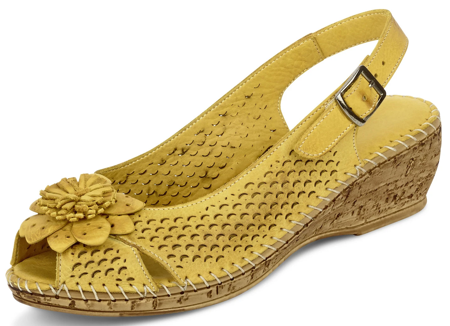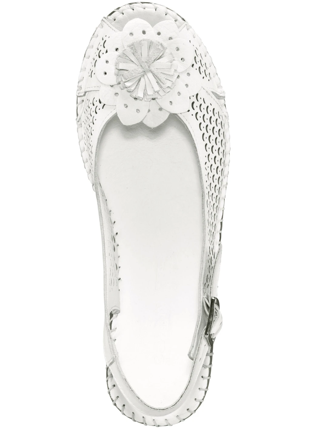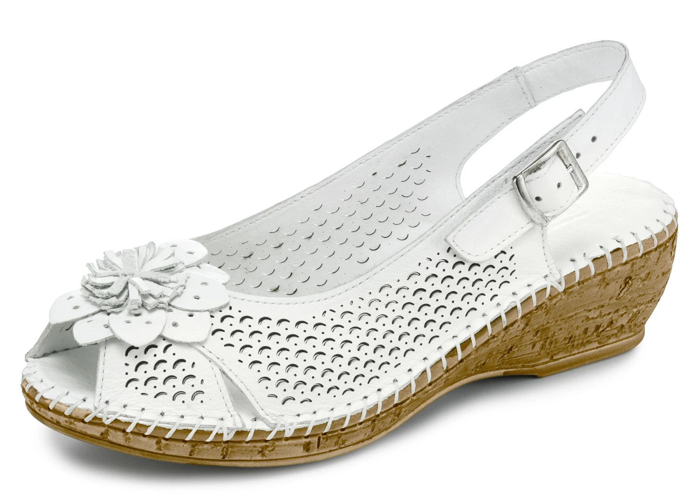 Sandalette aus perforiertem Rind-Nappaleder: in Weite G, Lederblüte, verstellbares Fersenriemchen mit verdecktem Gummizug, Lederfutter, gepolsterte Lederdecksohle, superleichte PU-Handnahtsohle und 40 mm Keilabsatz