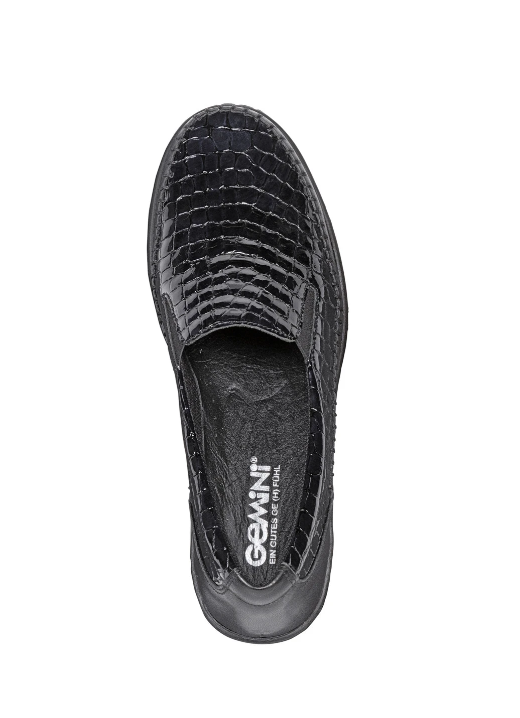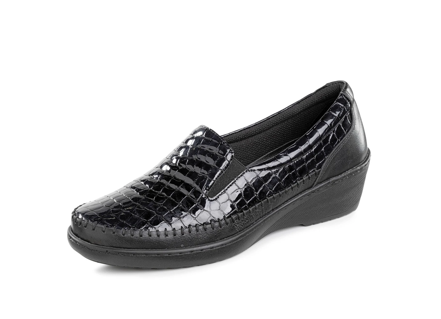 Slipper aus krokogeprägtem Lackleder und Nappaleder: in Weite H, angenehme Polsterung, zwei seitliche Gummizüge, Textilfutter, herausnehmbares Lederfußbett, superleichte PU-Riffelsohle sowie 25 mm Keilabsatz