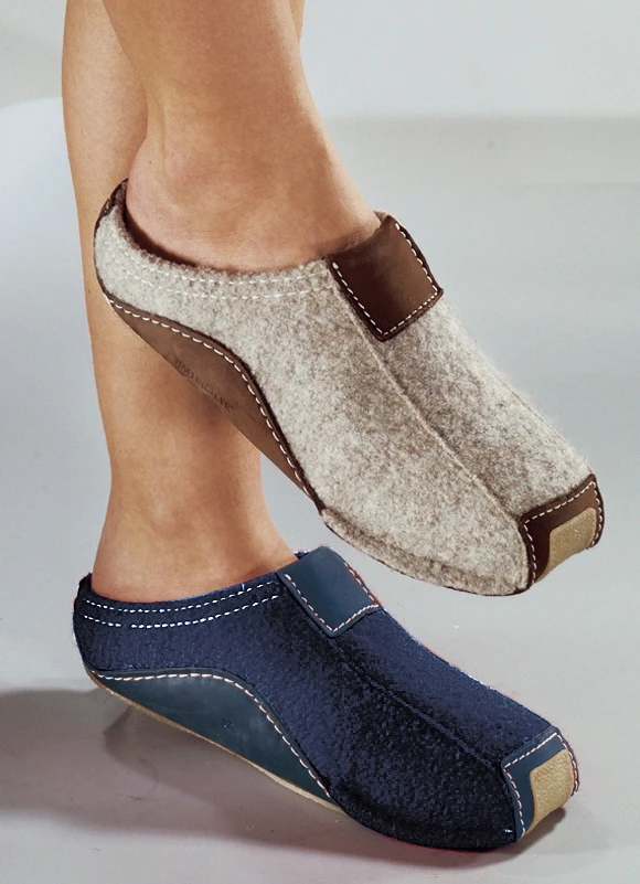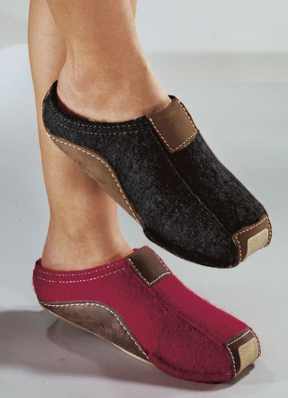 Hausschuh mit Walkstoff aus hochwertiger Schurwolle. Kork-Latex-Fußbett mit Decksohle aus reinem Wollwalkstoff, besonders luftdurchlässig und atmungsaktiv. Wirkt stoßdämpfend und unterstützt die natürliche Form des Fußes. Strapazierfähig, wärmeregulierend. Lederlaufsohle mit widerstandsfähiger Beschichtung aus Kautschukmischung. Ohne Weichspüler waschbar.