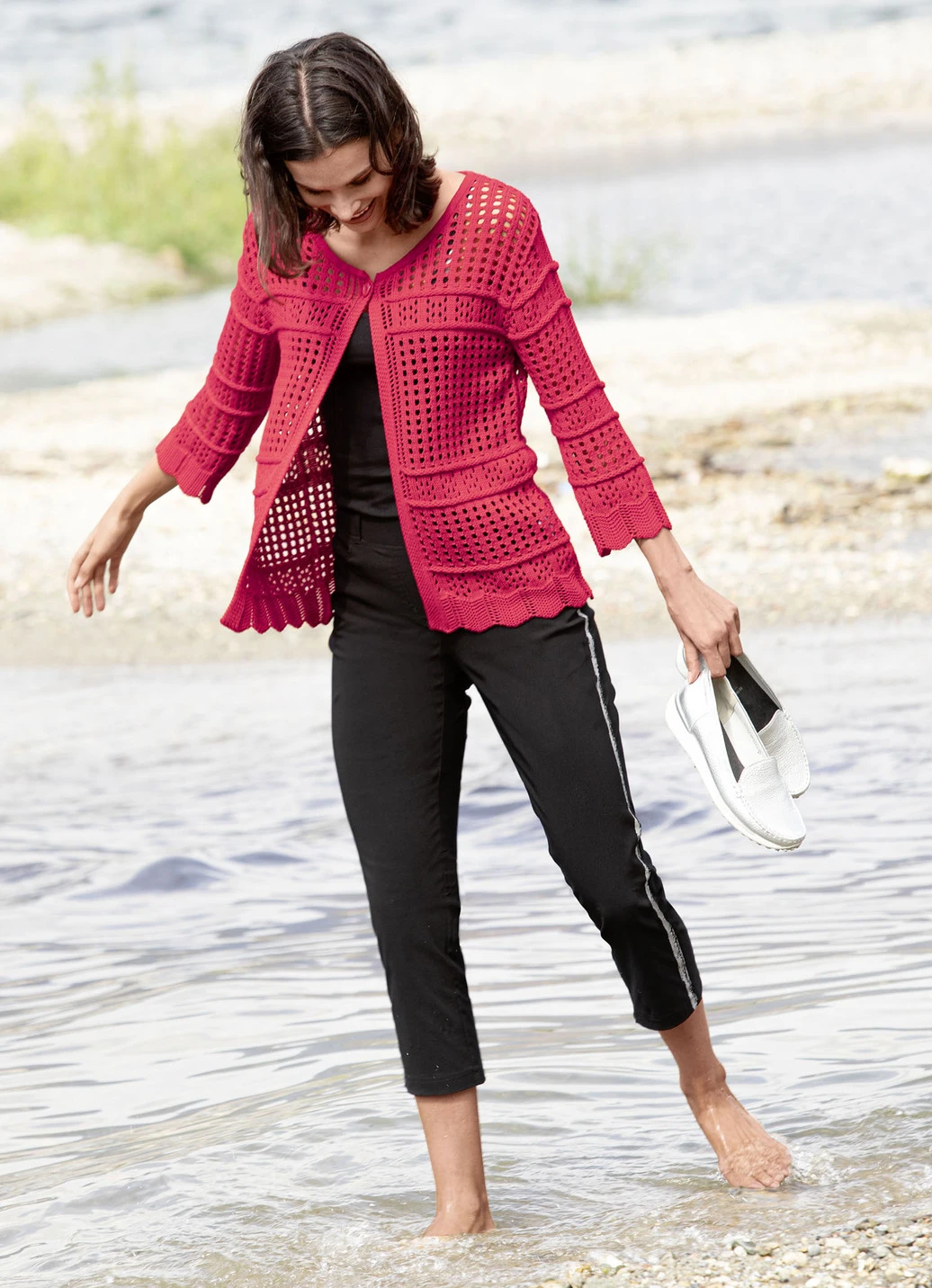 Flotte, hochelastische Hose in 7/8-Länge: mit angesagtem, silberfarbenem Galonstreifen entlang des Beinverlaufes, bequemer Schlupfform, glatt anliegend dank des innenliegenden, unsichtbaren Rundum-Dehnbundes, Gürtelschlaufen, angedeuteter Reißverschluss-Zierblende, Seitentaschen, aufgesetzten Gesäßtaschen sowie figurformender Passe im Rückteil. Innenbeinlänge ca. 63 cm.