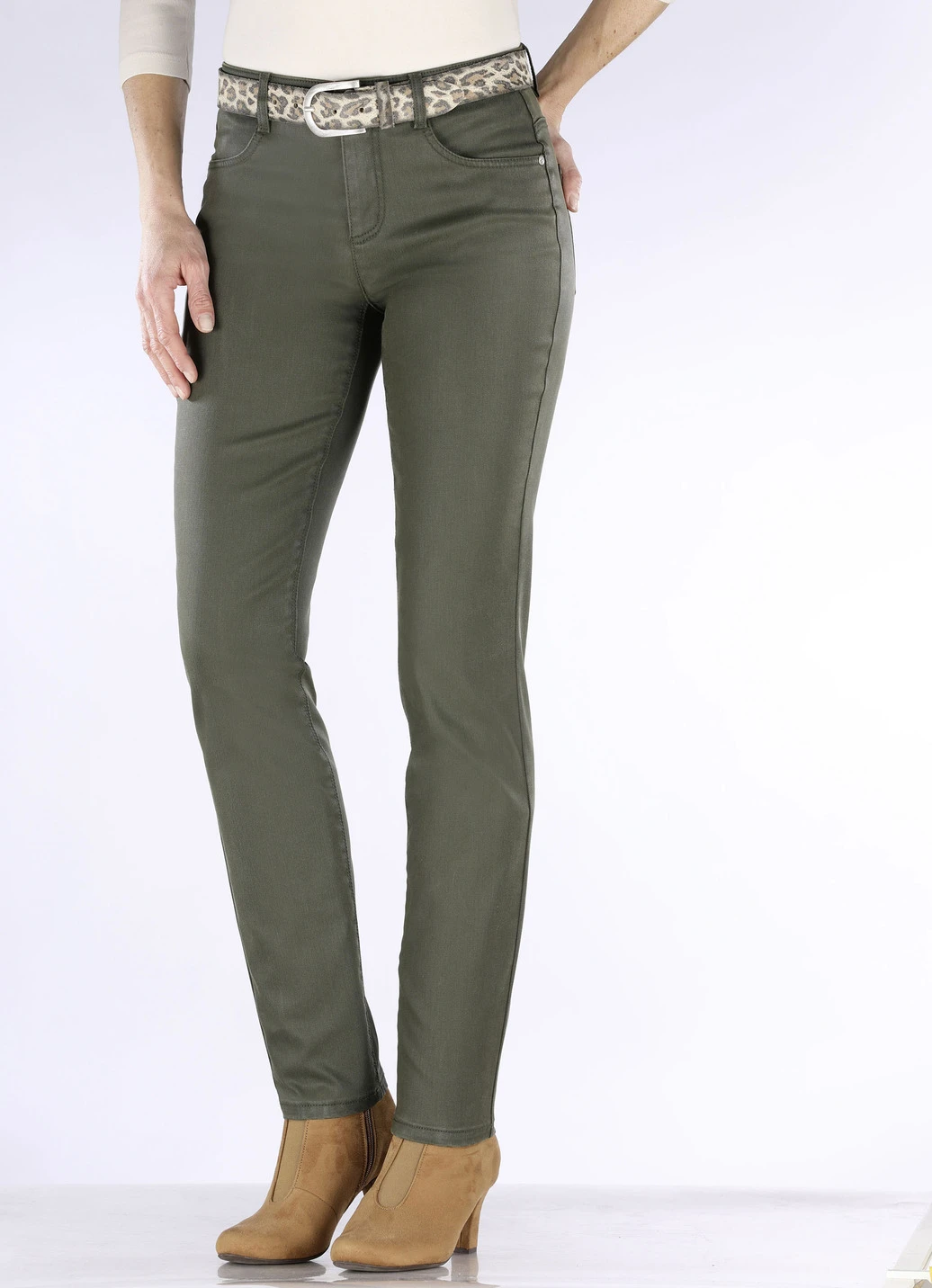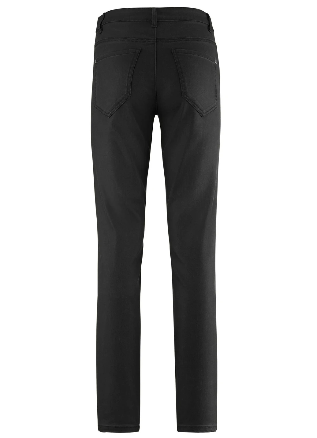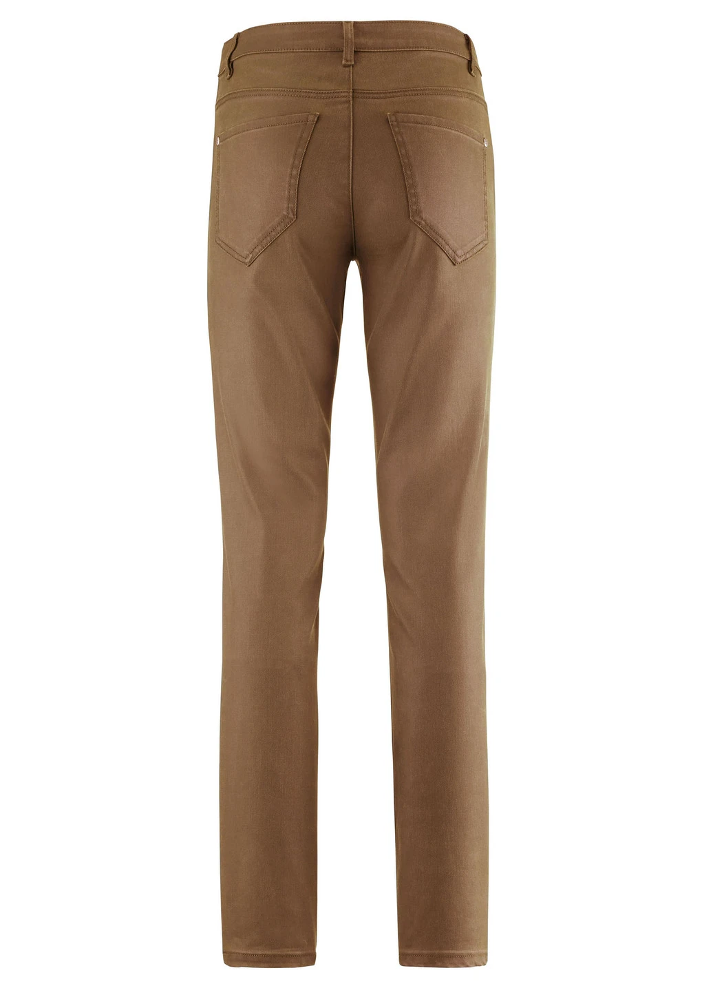 Mit sportivem Chic präsentiert sich diese edle, dezent schimmernde Hose: 4-Pocket-Form, elastischer Bund, Gürtelschlaufen, Knopf- und Reißverschluss, aparte Ziernieten an allen Taschen sowie figurformende Passe im Rückteil. Innenbeinlänge ca. 77 cm, Fußweite ab 30 cm.