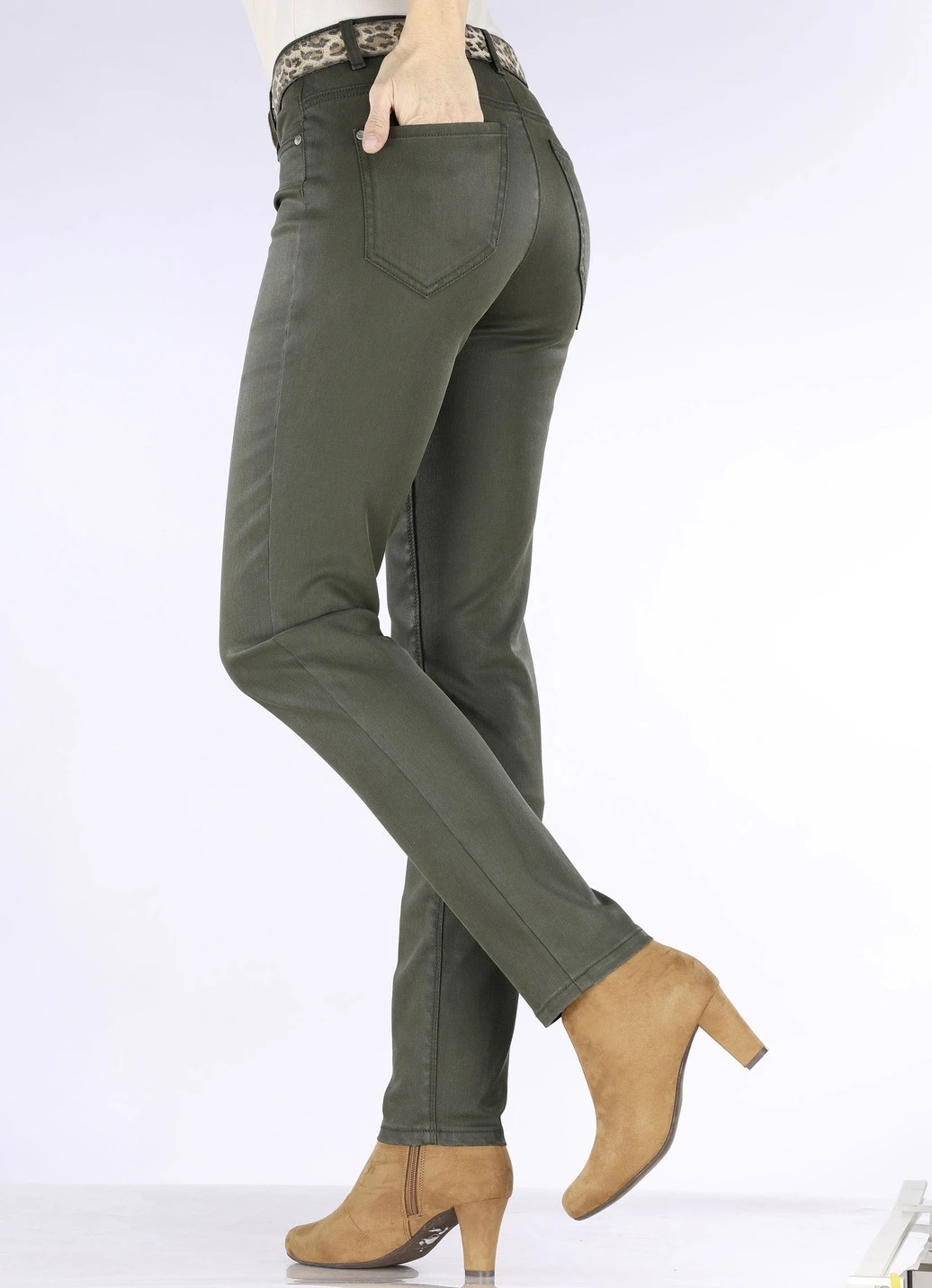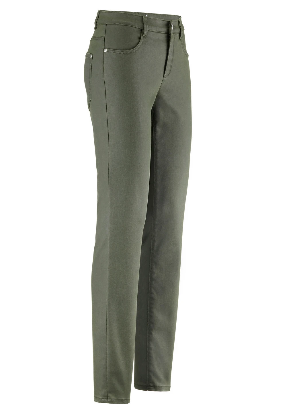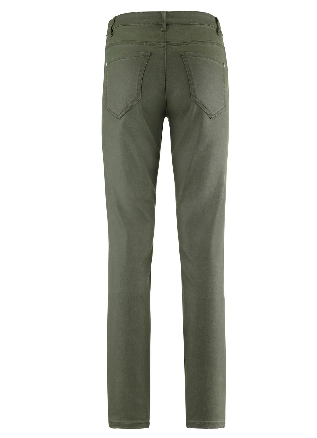 Mit sportivem Chic präsentiert sich diese edle, dezent schimmernde Hose: 4-Pocket-Form, elastischer Bund, Gürtelschlaufen, Knopf- und Reißverschluss, aparte Ziernieten an allen Taschen sowie figurformende Passe im Rückteil. Innenbeinlänge ca. 77 cm, Fußweite ab 30 cm.