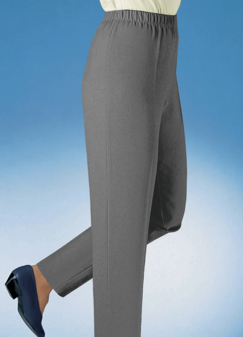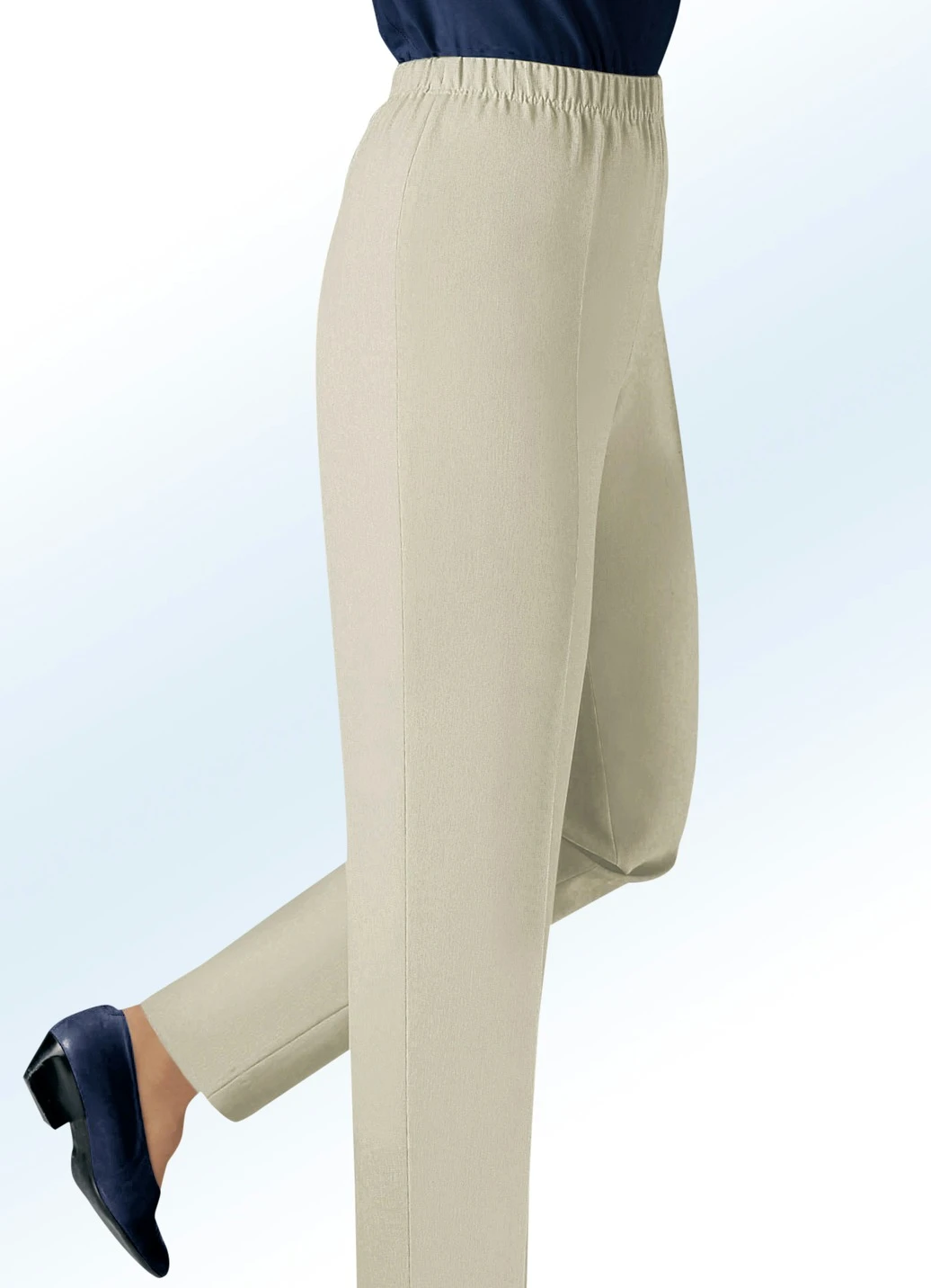 Beliebte Hose in Schlupfform: Dehnbund rundum, seitlich geschlitzte Beinabschlüsse. Innenbeinlänge ca. 75 cm, Fußweite ab 39 cm.