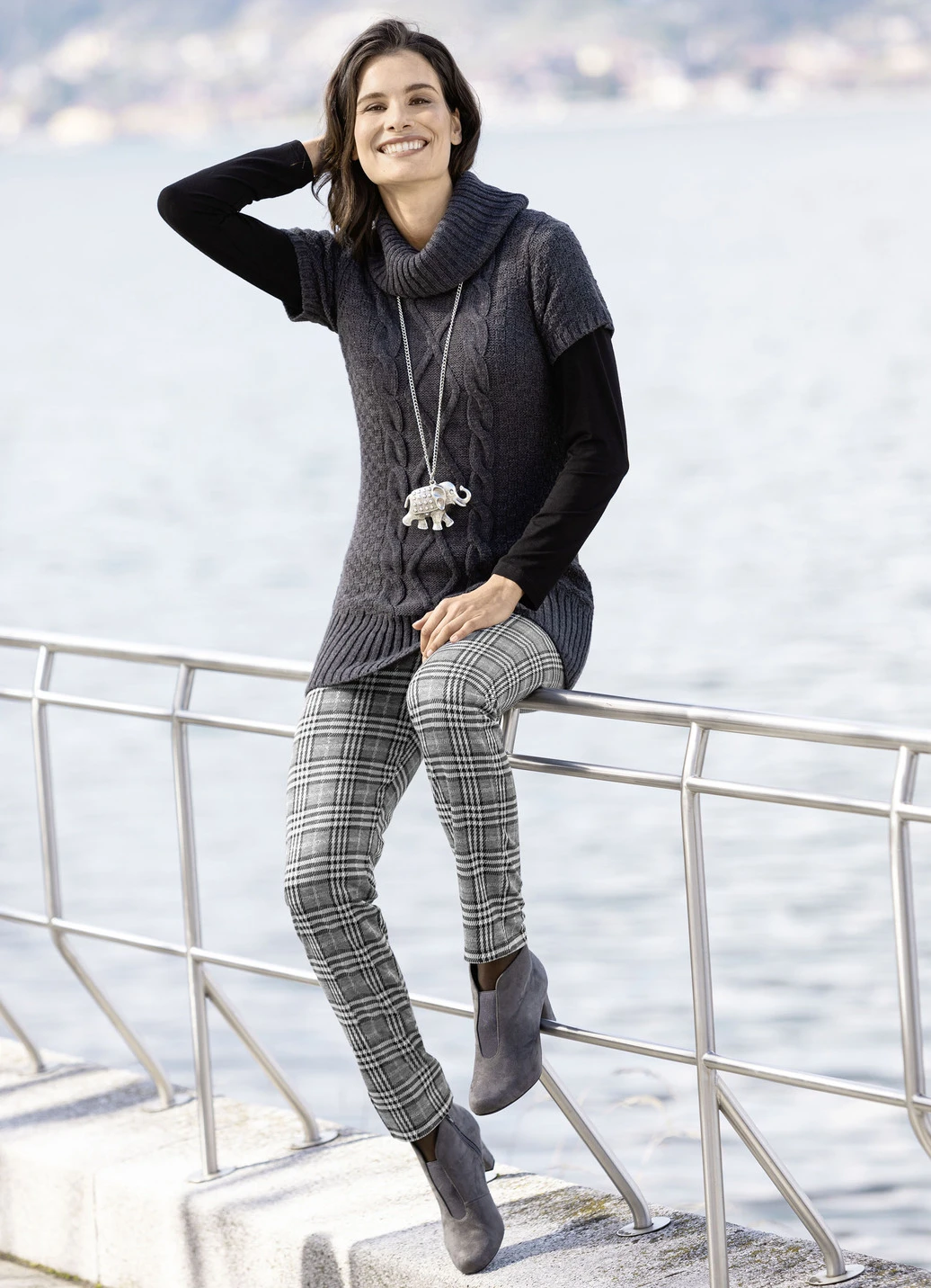 Angesagte und sehr bequeme Hose in Schlupfform mit interessanter Karo-Dessinierung in Hellgrau-Schwarz-Ecru: figurformend durch den angeschnittenen Bund, glatt anliegend dank der innenliegenden Gumibund-Einlage. Innenbeinlänge ca. 77 cm, Fußweite ab 32 cm.