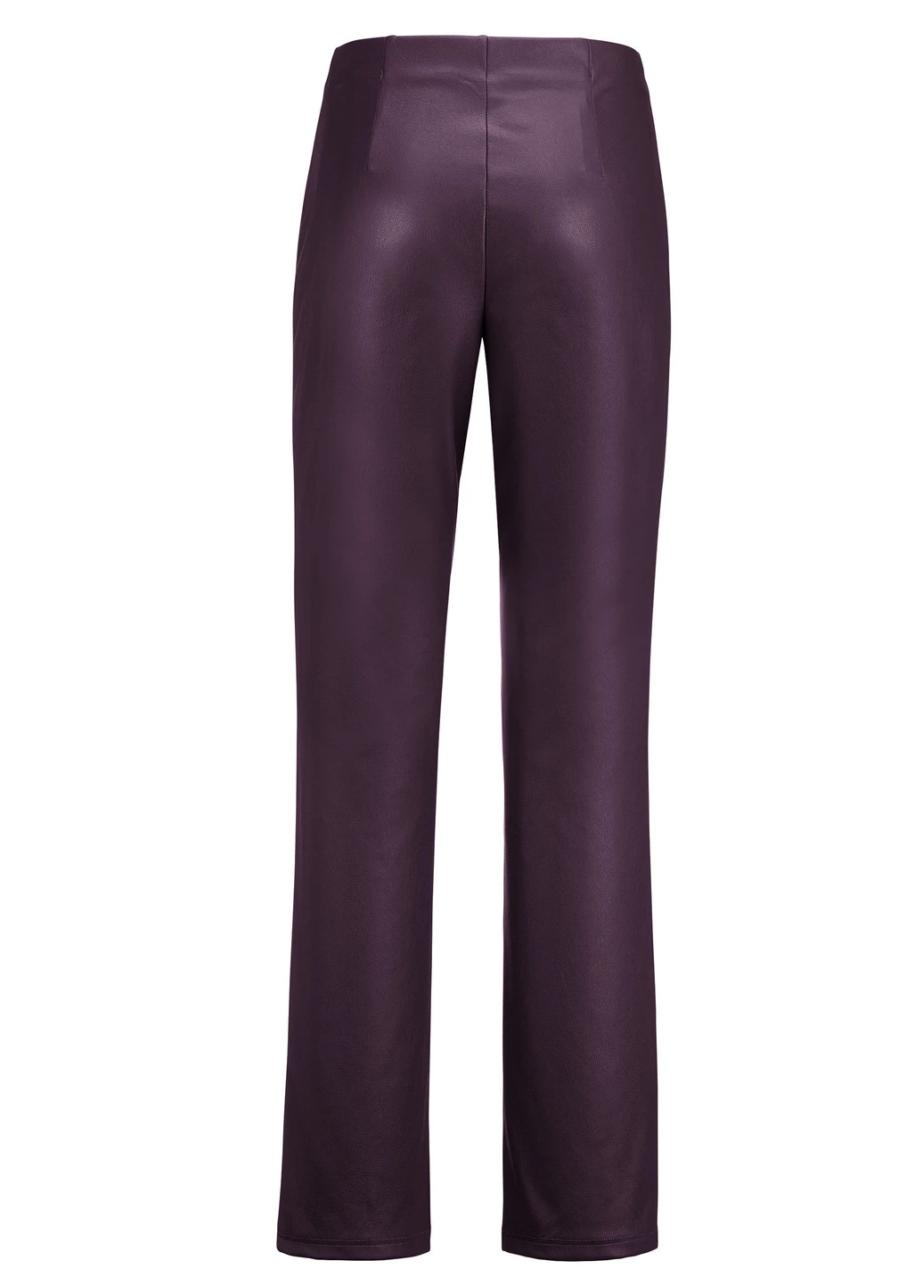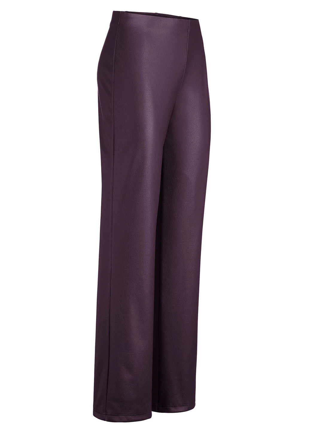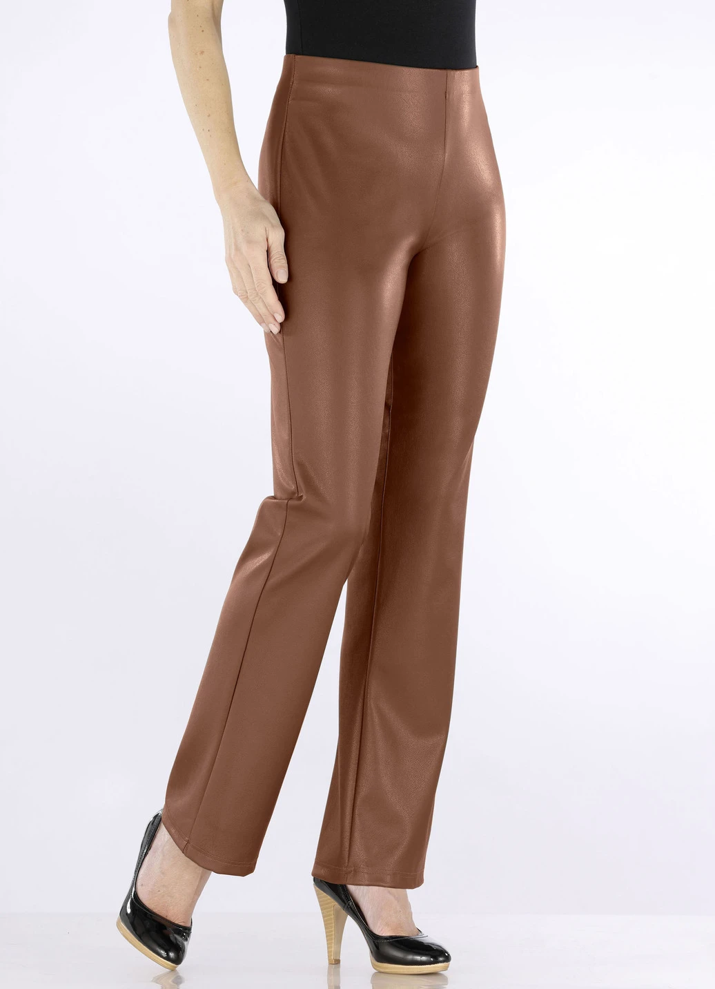 Ihr Modell PEGGY – attraktive Hose aus softem Nappaleder-Imitat mit ausgestellter Fußweite: in Schlupfform mit angeschnittenem, erhöhtem Stretchbund für eine figurformende, schlanke Passform. Innenbeinlänge ca. 78 cm, Fußweite ab 46 cm.