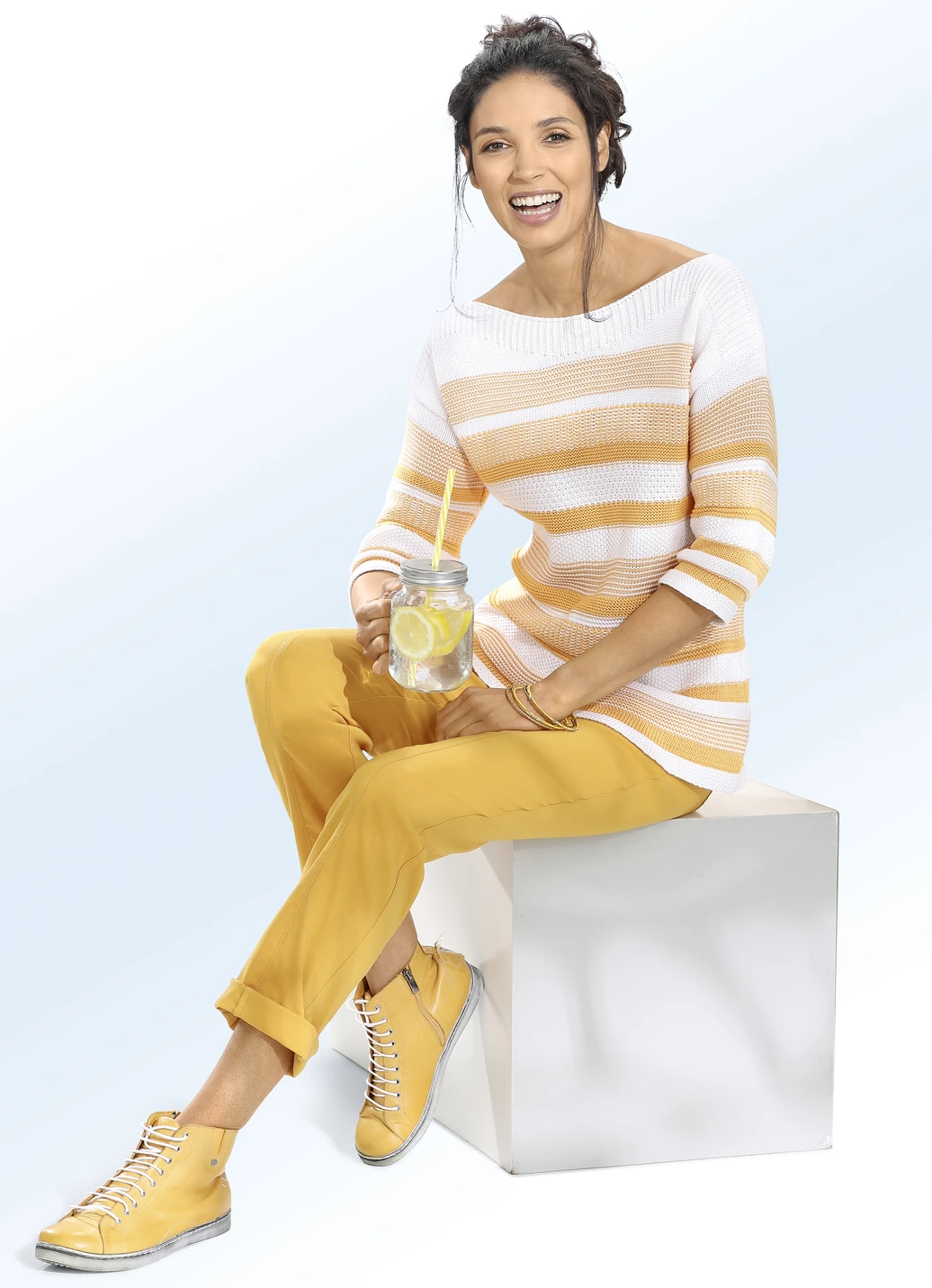 Flotte, aufwendig gearbeitete, hochelastische Hose in Maisgelb: elastischer Bund mit dekorativem, kontrastfarbenen Zierband, Gürtelschlaufen, Knopf- und Reißverschluss, paspelierte Seitentaschen mit Reißverschluss und Zieranhänger, Gesäßtaschen, Passe im Rückteil, figurgünstige, abgesteppte Teilungsnähte im Vorder- und Rückteil. Innenbeinlänge ca. 78 cm, Fußweite ab 36 cm.