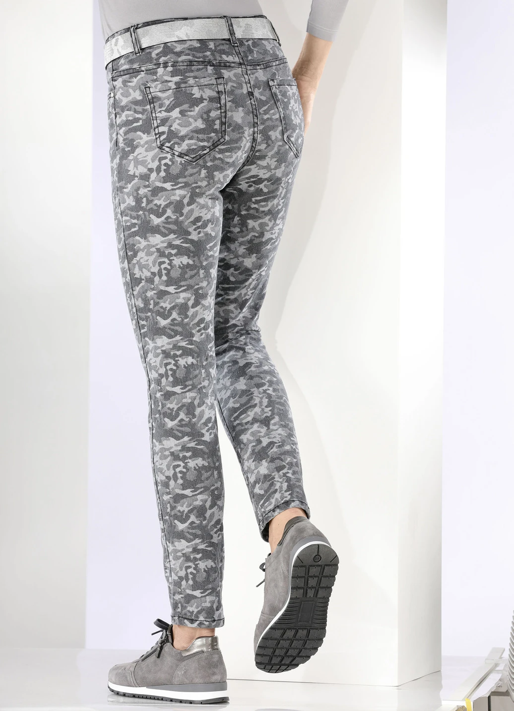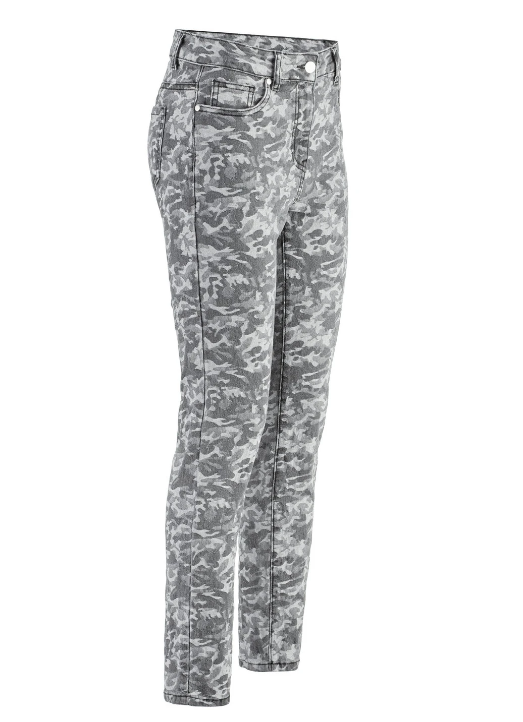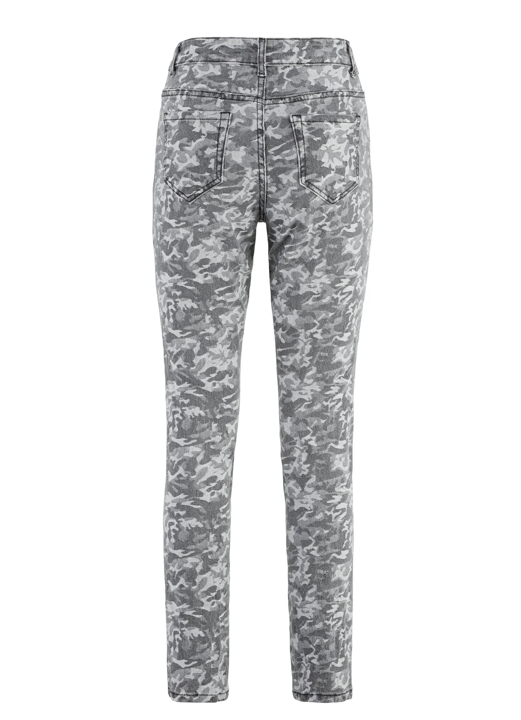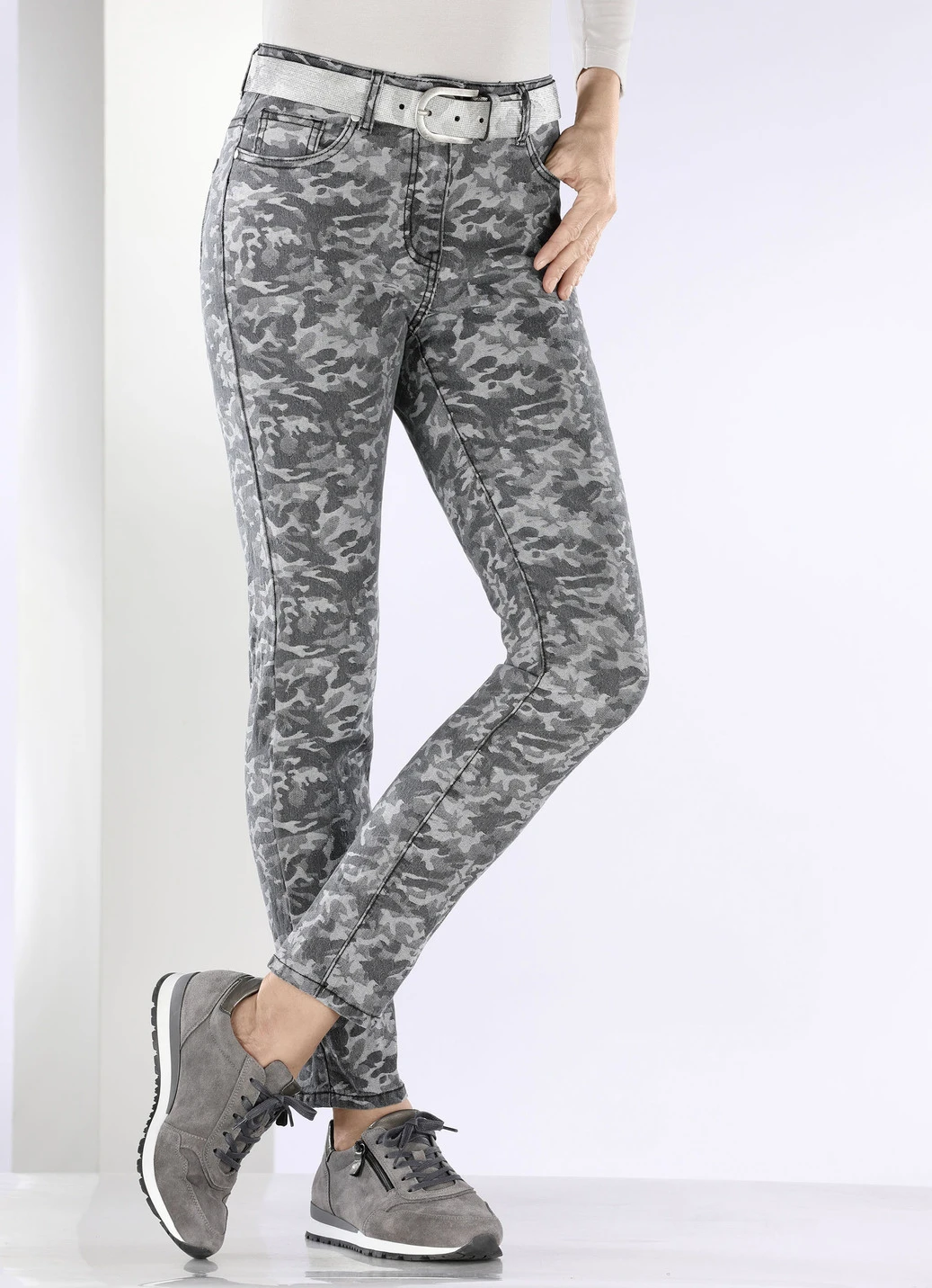 Ein echter Hingucker ist diese angesagte, knöchellange Jeans in 5-Pocket-Form und interessanter Camouflage-Dessinierung: elastischer Formbund, Gürtelschlaufen, Knopf- und Reißverschluss sowie Jeanssattel. Ohne Gürtel. Innenbeinlänge ca. 72 cm, Fußweite ab 29 cm.