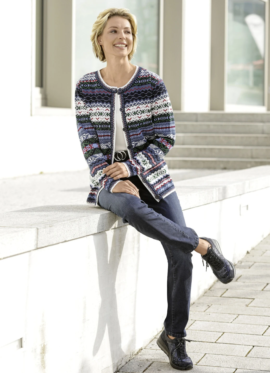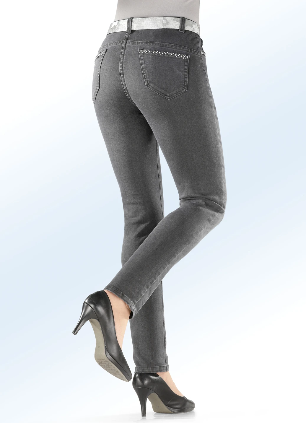 Für hohen Tragekomfort sorgt diese attraktive Komfortjeans in 5-Pocket-Form: 4 cm weiterer Bundumfang, elastischer Bund, ab Gr. 44, 22 bzw. 225 mit rückwärtigen Dehnbundeinsätzen, Knopf- und Reißverschluss, Ziernieten, edler Glitzersteinchenbesatz an den aufgesetzten Gesäßtaschen und unterhalb der Seitentaschen, Jeanssattel sowie dezente Auswascheffekte. Innenbeinlänge ca. 77 cm, Fußweite ab 36 cm.