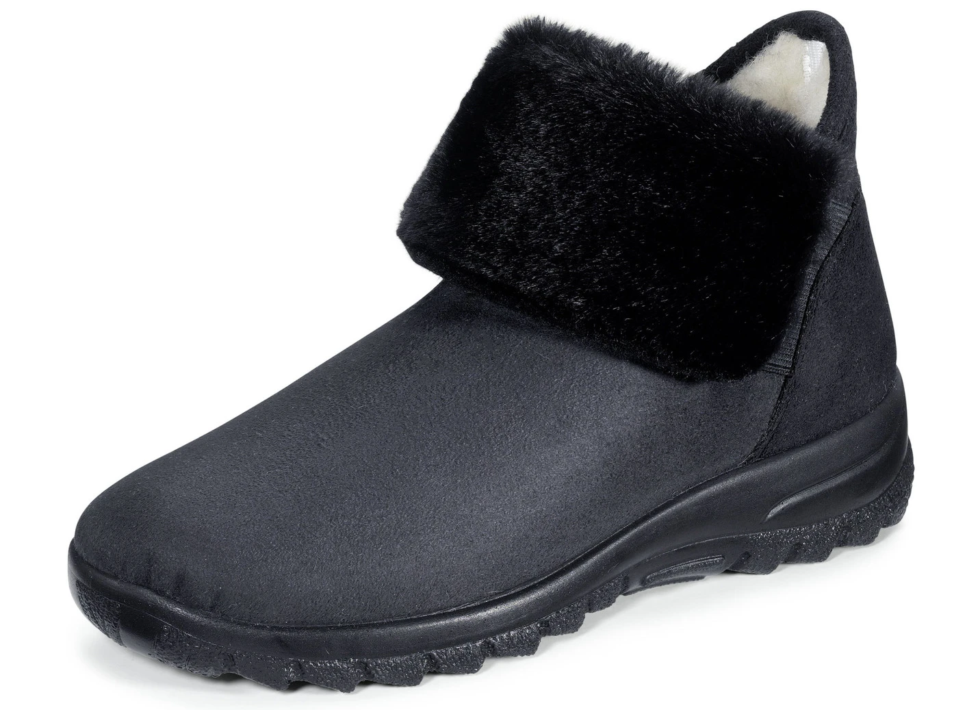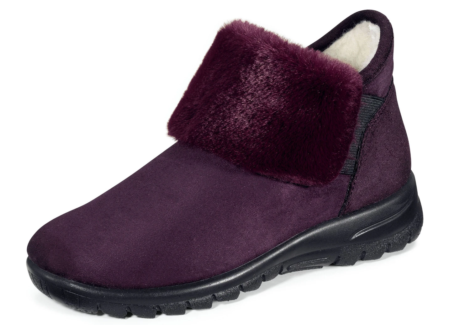 „Laurina“-Schlupf-Stiefelette aus weichem Veloursmaterial mit kuscheligem Plüschbesatz: in Weite H, seitliche Gummizüge, Warmfutter und Fußbettbezug aus reiner Wolle, superleichte PU-Profilsohle sowie 25 mm Keilabsatz. Schafthöhe ca. 11 cm