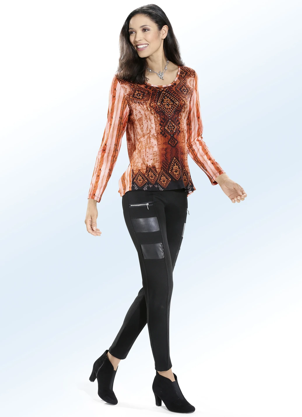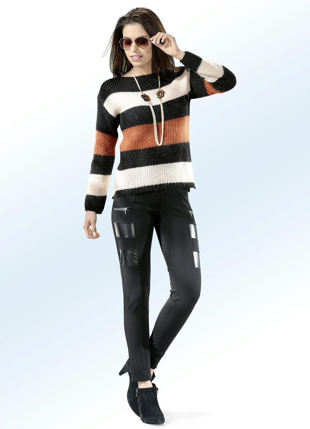 Außergewöhnlich gestylte, schwarze Leggings im interessanten Materialmix: in bequemer Schlupfform, glatt anliegend dank des innenliegenden, unsichtbaren Rundum-Dehnbundes, vordere, angedeutete Reißverschluss-Zierblende, schöne Zier-Reißverschlüsse, streckende Teilungsnähte sowie tolle, vordere Einsätze aus softem Nappaleder-Imitat vorne und hinten sowie figurformende Passe im Rückteil.