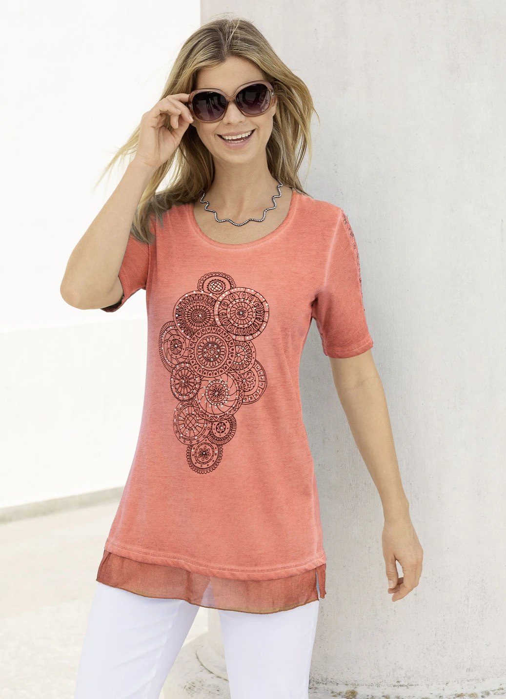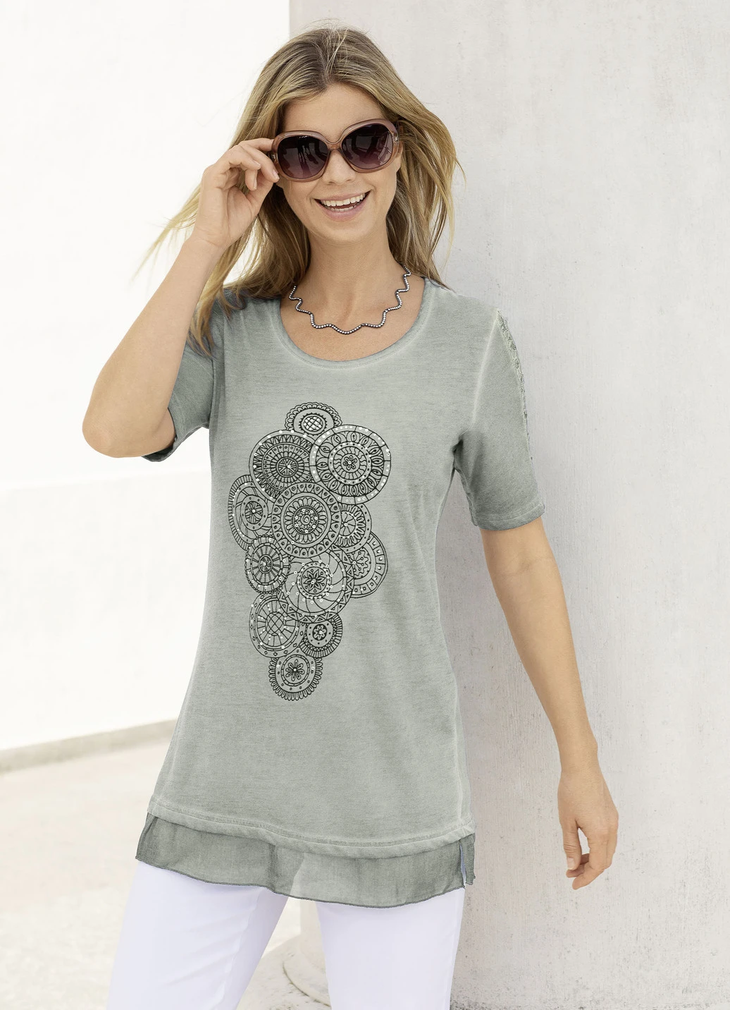 Jedes Teil ein Unikat! In angesagter Kaltfärbung zeigt sich dieses jeansblaue Longshirt mit Kontrast-Druck und Strasszier im Vorderteil, Spitzeneinsatz an den Ärmeln sowie gekäntelter, geschlitzter Chiffon-Abschluss am Saum.