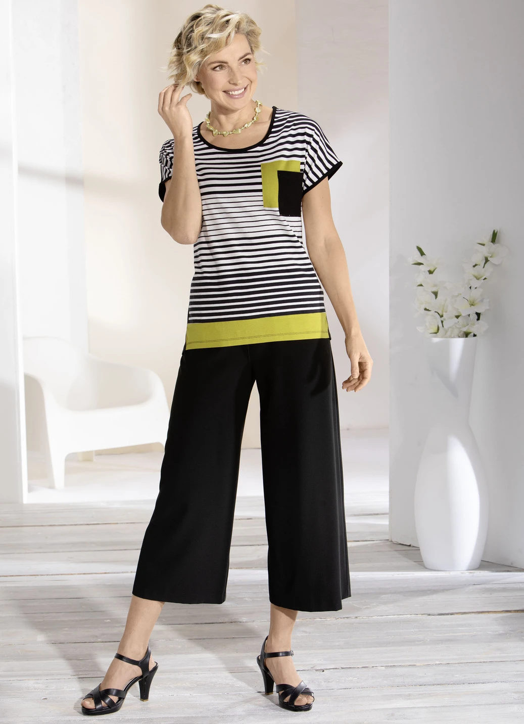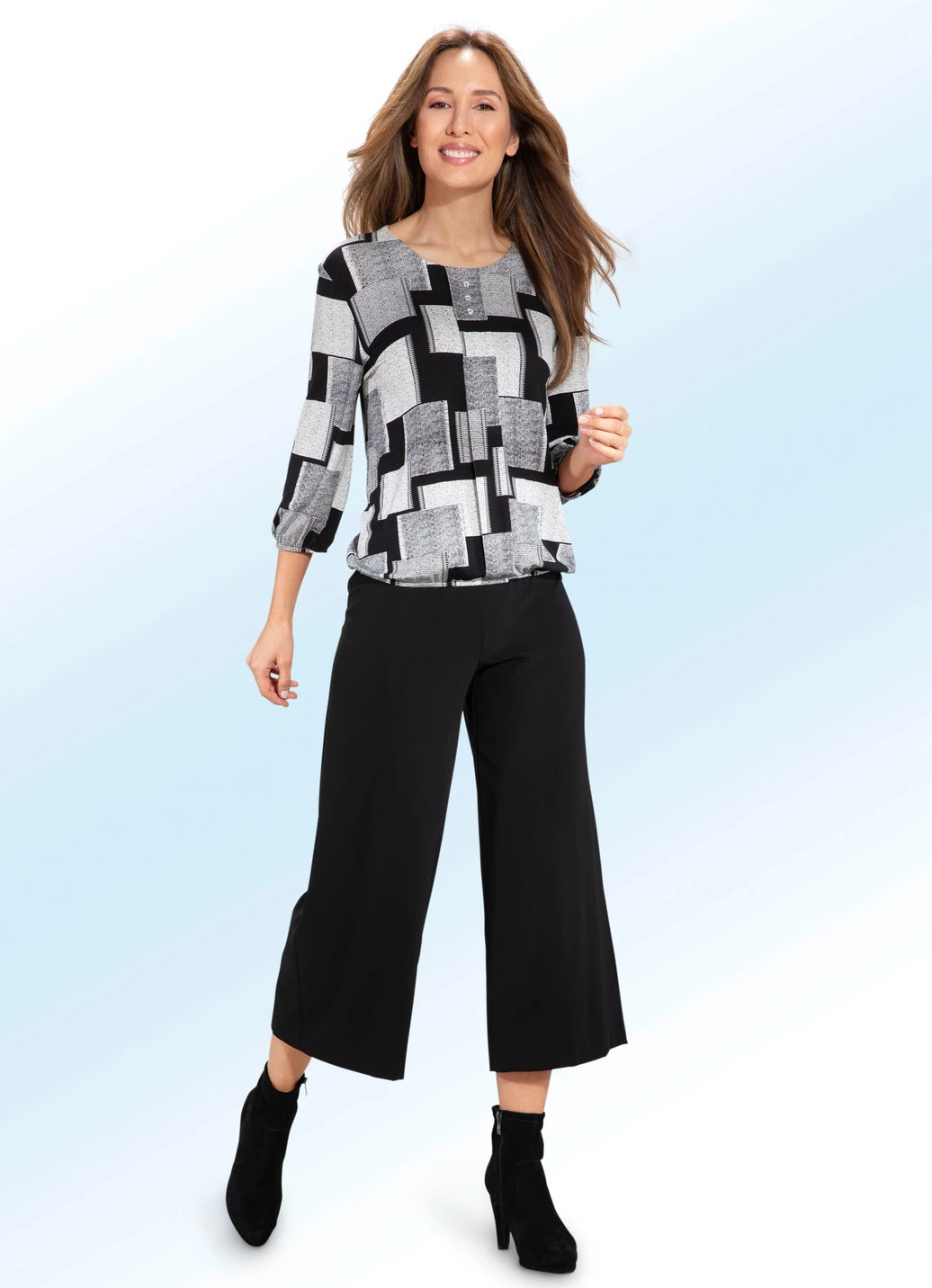 Angesagte, weich fließende Culotte: in bequemer Schlupfform, mit Dehnbund rundum sowie weitem, schön fallendem Saumabschluss, der diesem Modell seine feminine Eleganz verleiht. Länge ab Taille ca. 85 cm, bei K-Gr. ca. 79 cm.