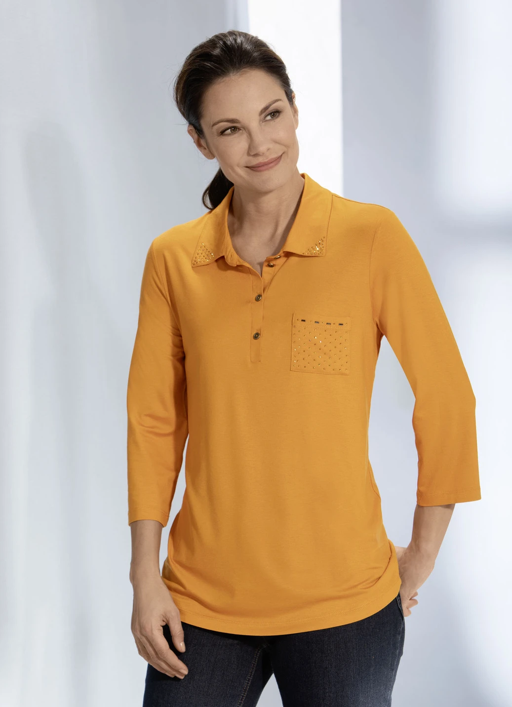 Schickes Poloshirt mit kurzer Knopfleiste, Strasszier am Polokragen, Strass- und Plättchenzier an der aufgesetzten Brusttasche sowie 3/4-langen Ärmeln.