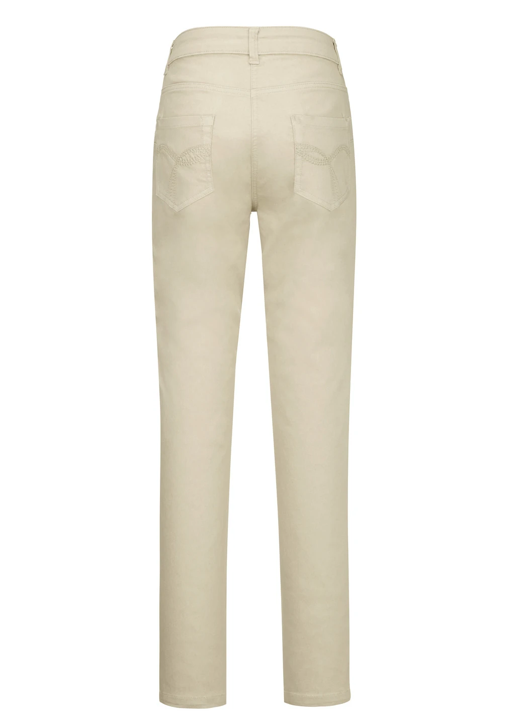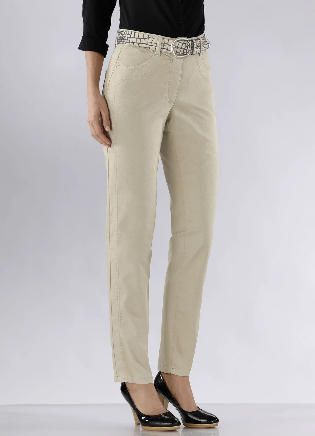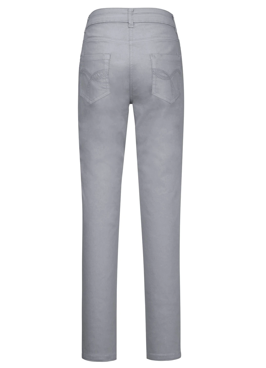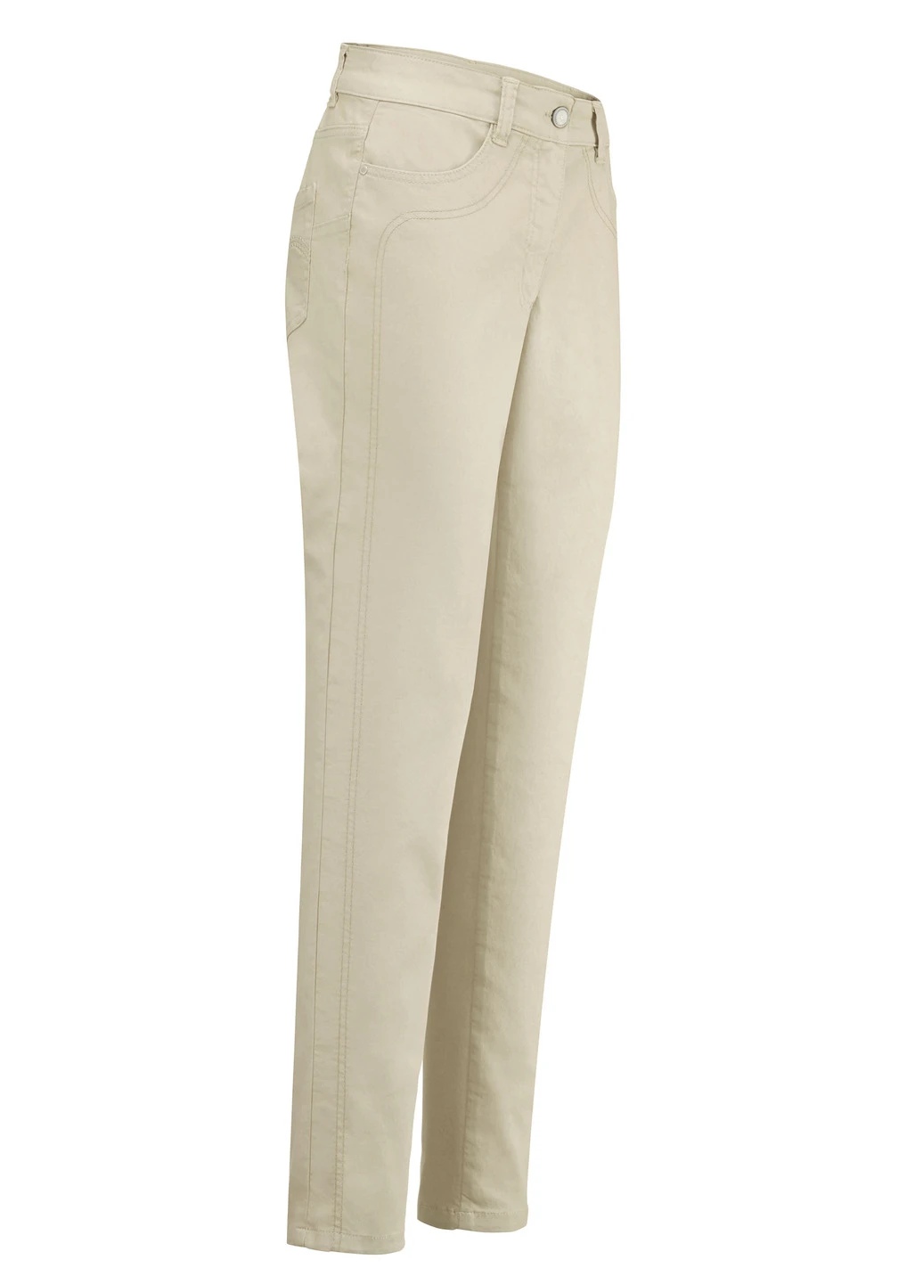 Figurformende Power-Stretch-Jeans mit exzellentem Rücksprungverhalten: elastischer Formbund, Knopf- und Reißverschluss, Ziernieten vorne, Ziersteppungen unterhalb der Seitentaschen und entlang des Beinverlaufes, die für eine streckende Optik sorgen, Jeanssattel, Stickereien an den Gesäßtaschen. Die aktuellen Waschungen garantieren eine tolle Optik! Ohne Gürtel. Innenbeinlänge ca. 77 cm, Fußweite ab 32 cm.