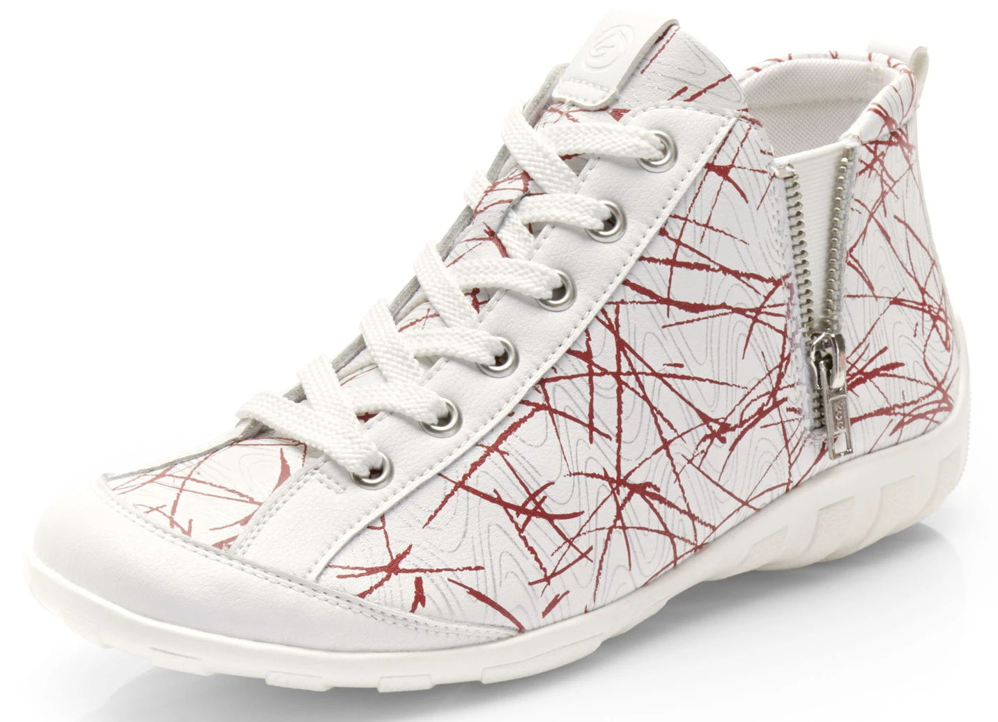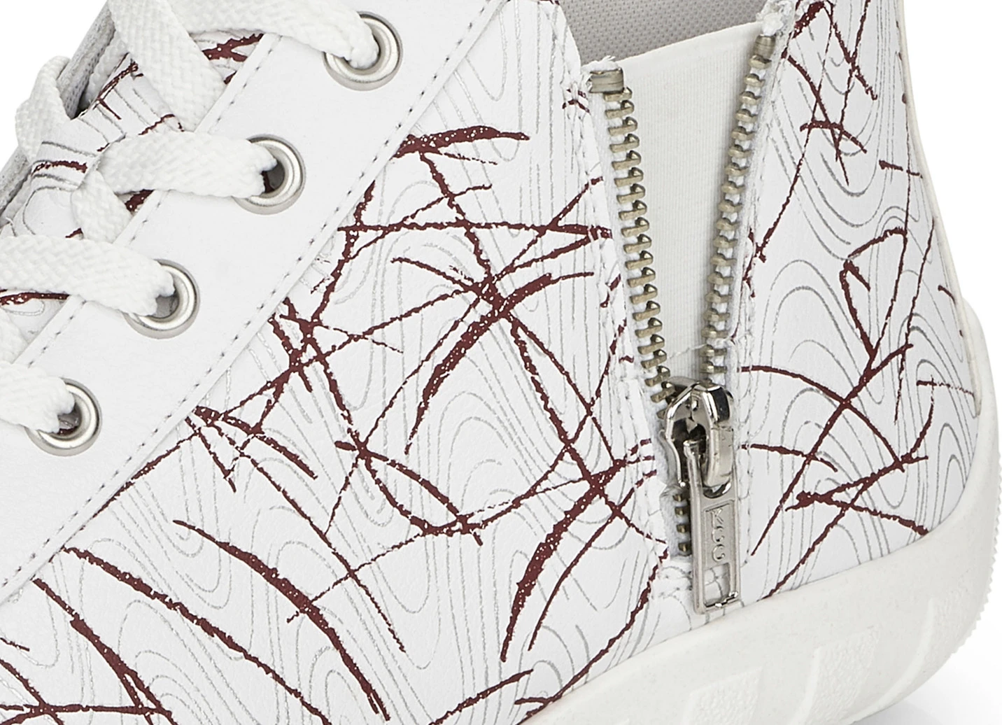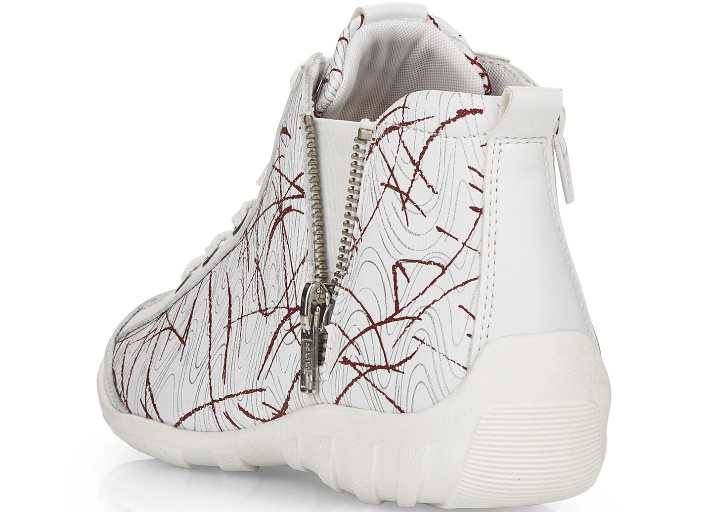 Remonte Schnür-Stiefelette aus effektvoll bedrucktem Nappaleder in Weiss-Rot und in Größe 36.