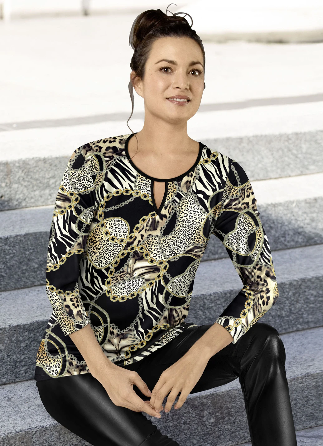 Jedes Teil ein Unikat! Shirt mit farbbrillantem Inkjet-Druck allover in Schwarz-Braun-Ecru, Halsausschnitt mit Zierschlitz sowie 3/4-langen Ärmeln.