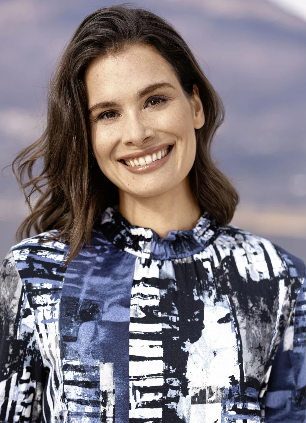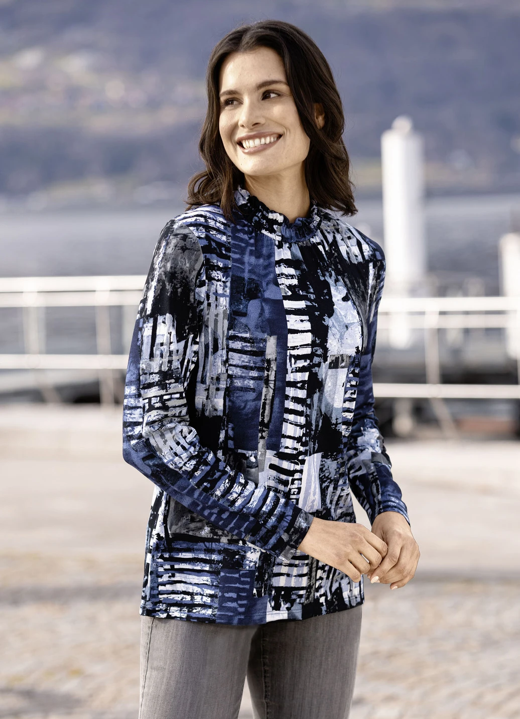 Jedes Teil ein Unikat! Apartes Shirt mit Alloverdruck in Blau-Multicolor: schmeichelnder, gesmokter Stehbund sowie lange Ärmel.