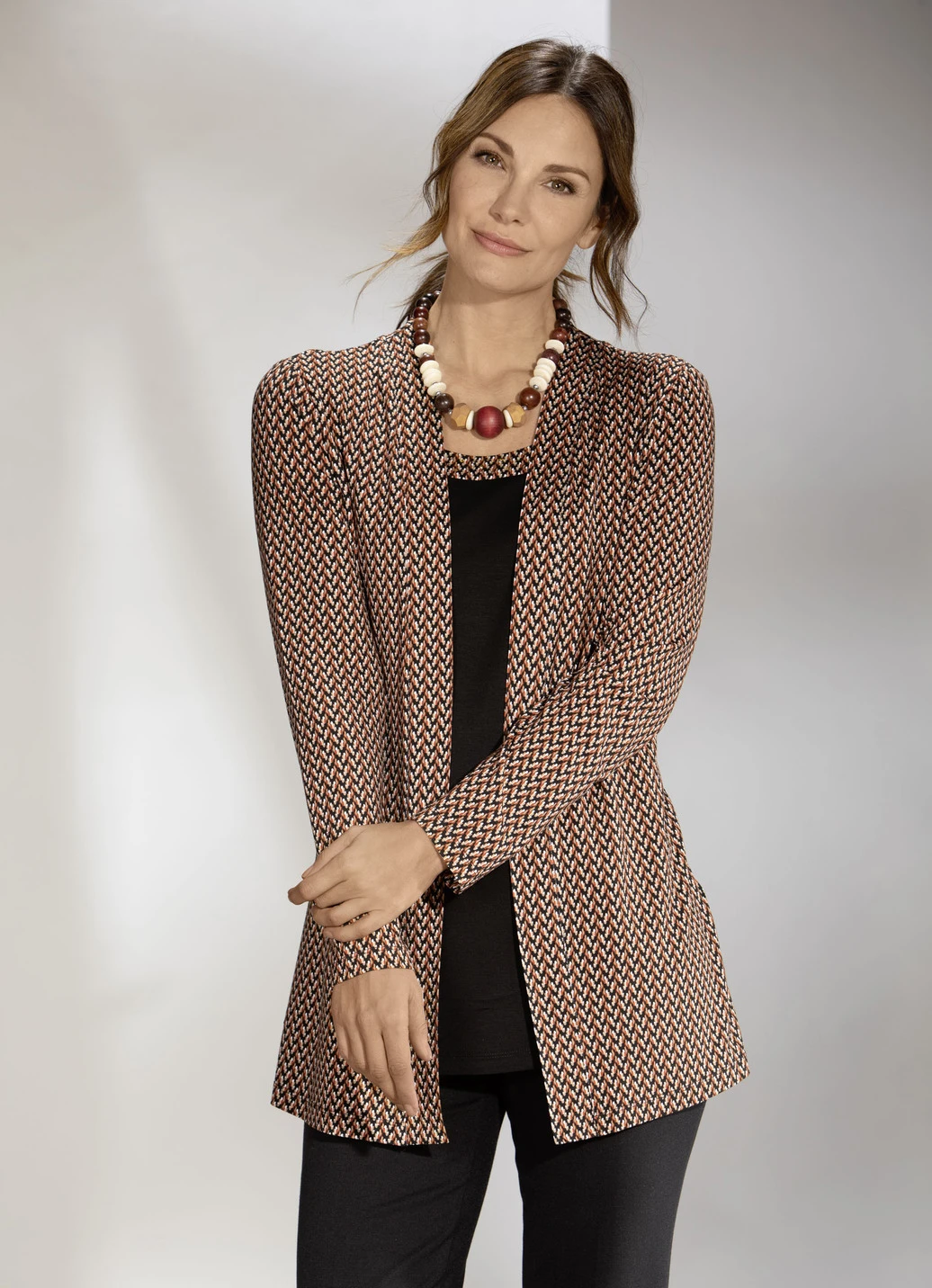 Große Klasse ist dieses faszinierende schwarz-braun-terrakotta-bunte, allover gemusterte Shirt in Jacken-Optik, mit schwarzem Einsatz sowie Strasszier am Halsausschnitt.