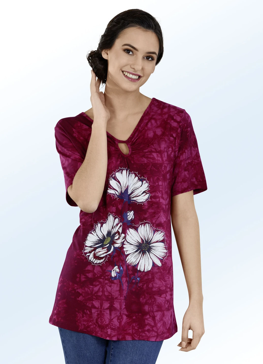Jedes Teil ein Unikat! Shirt in Batik-Optik mit interessanter Ausschnittverarbeitung und Kräuselung sowie Kontrast-Druck und Strasszier im Vorderteil.