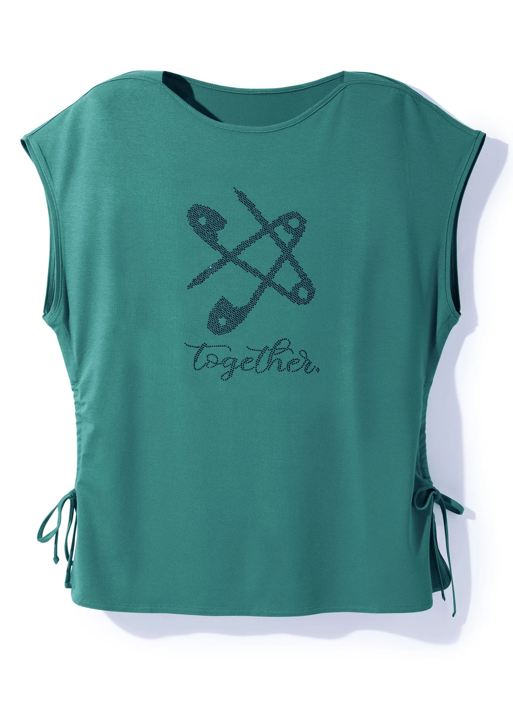Fabelhaftes Shirt mit Strasszier im Vorderteil, überschnittener Schulterpartie und seitliche Raffung durch Bindeband sowie abgerundeten Seitenschlitzen.