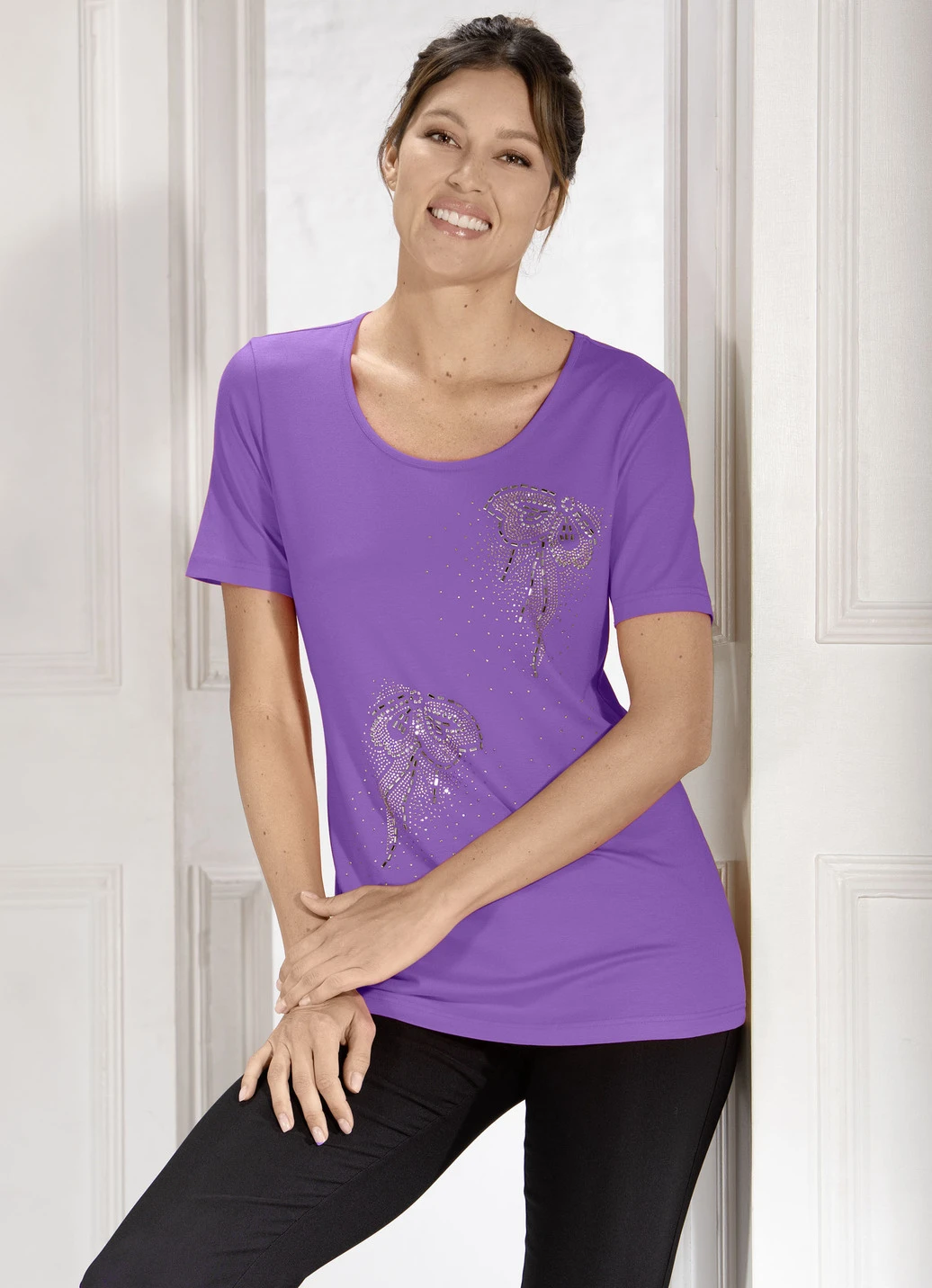 Shirt mit Strass- und Plättchenzier in 2 Farben in Lila und in Größe 40.