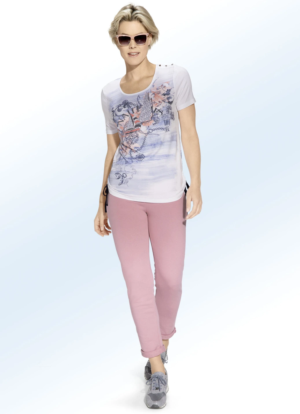 Angesagte, softe und sehr bequeme Jerseyhose in Rosé: in Schlupfform, glatt anliegend dank des innenliegenden, unsichtbaren Rundum-Dehnbundes, Reißverschluss-Zierblende sowie Seitentaschen. Innenbeinlänge ca. 75 cm, Fußweite ab 31 cm.