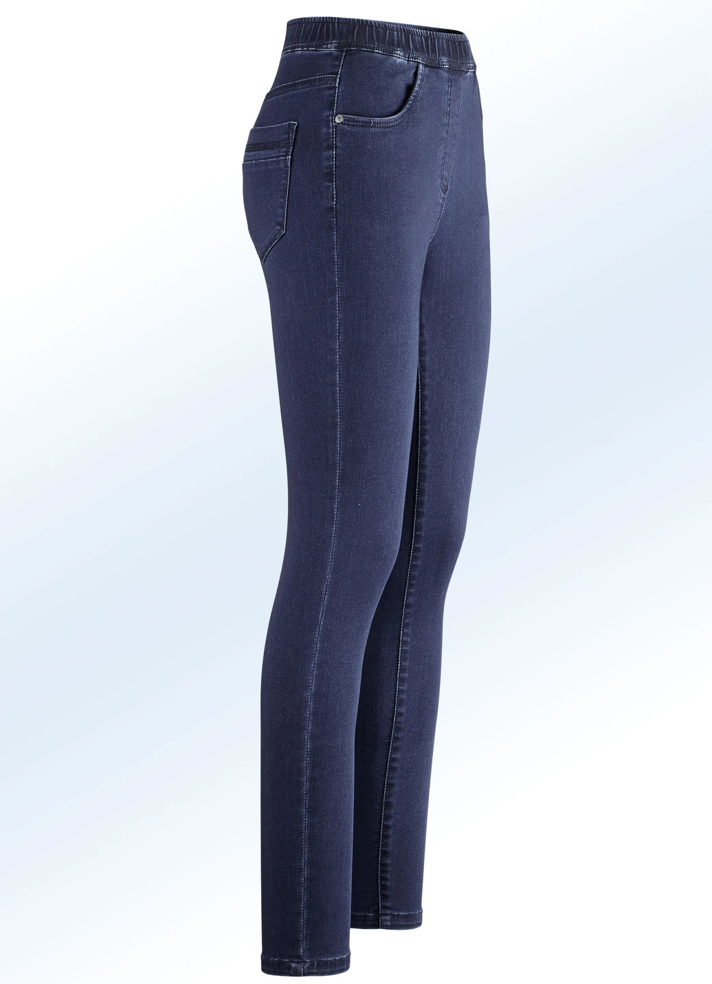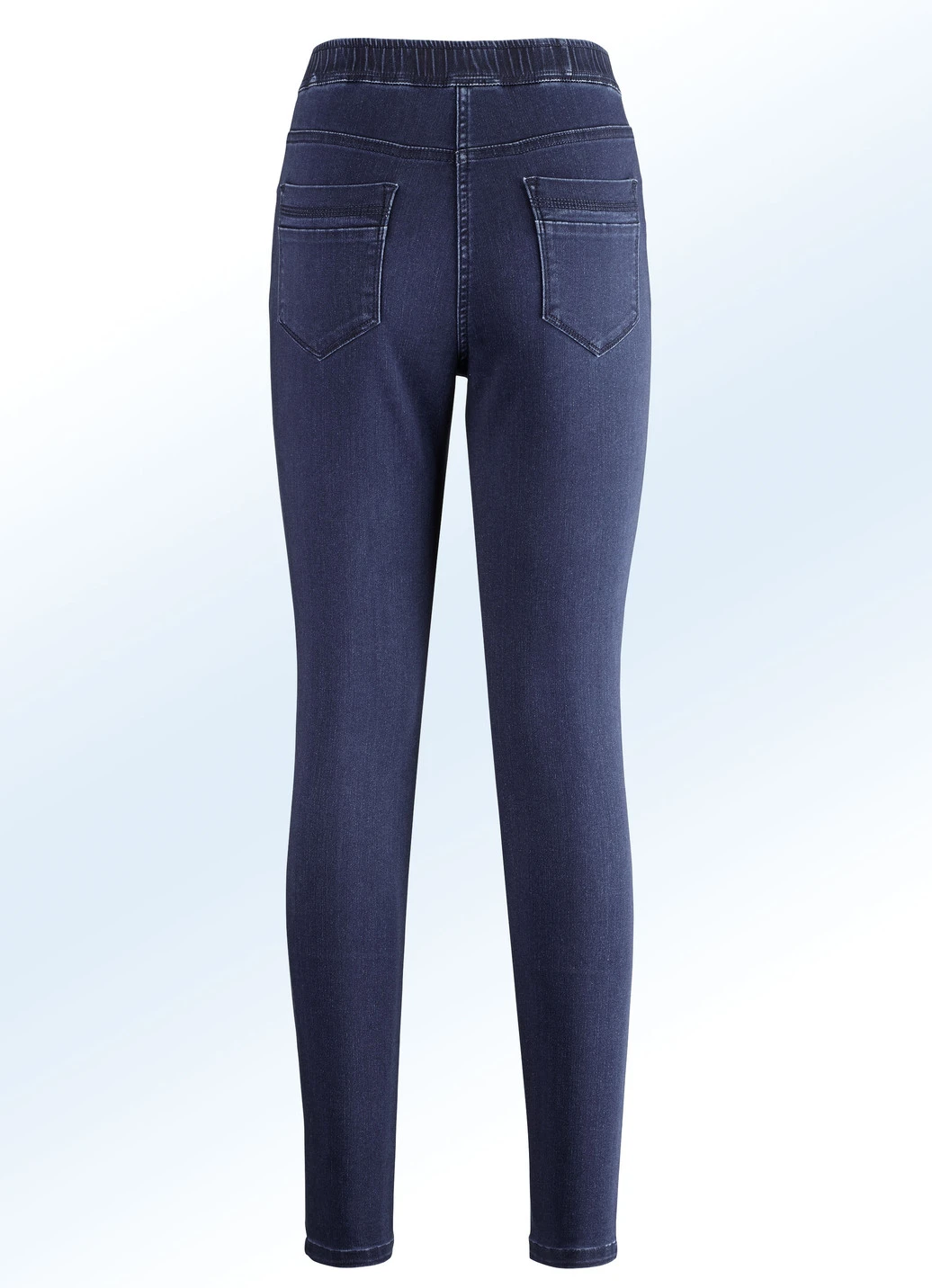 Hochelastische, super softe Jegging-Jeans in bequemer Schlupfform: Rundum-Dehnbund, Reißverschluss-Zierblende, Ziernieten an den Seitentaschen, aufgesetzte Gesäßtaschen mit schönen Ziersteppungen sowie Jeanssattel. Innenbeinlänge ca. 78 cm, Fußweite ab 24 cm.