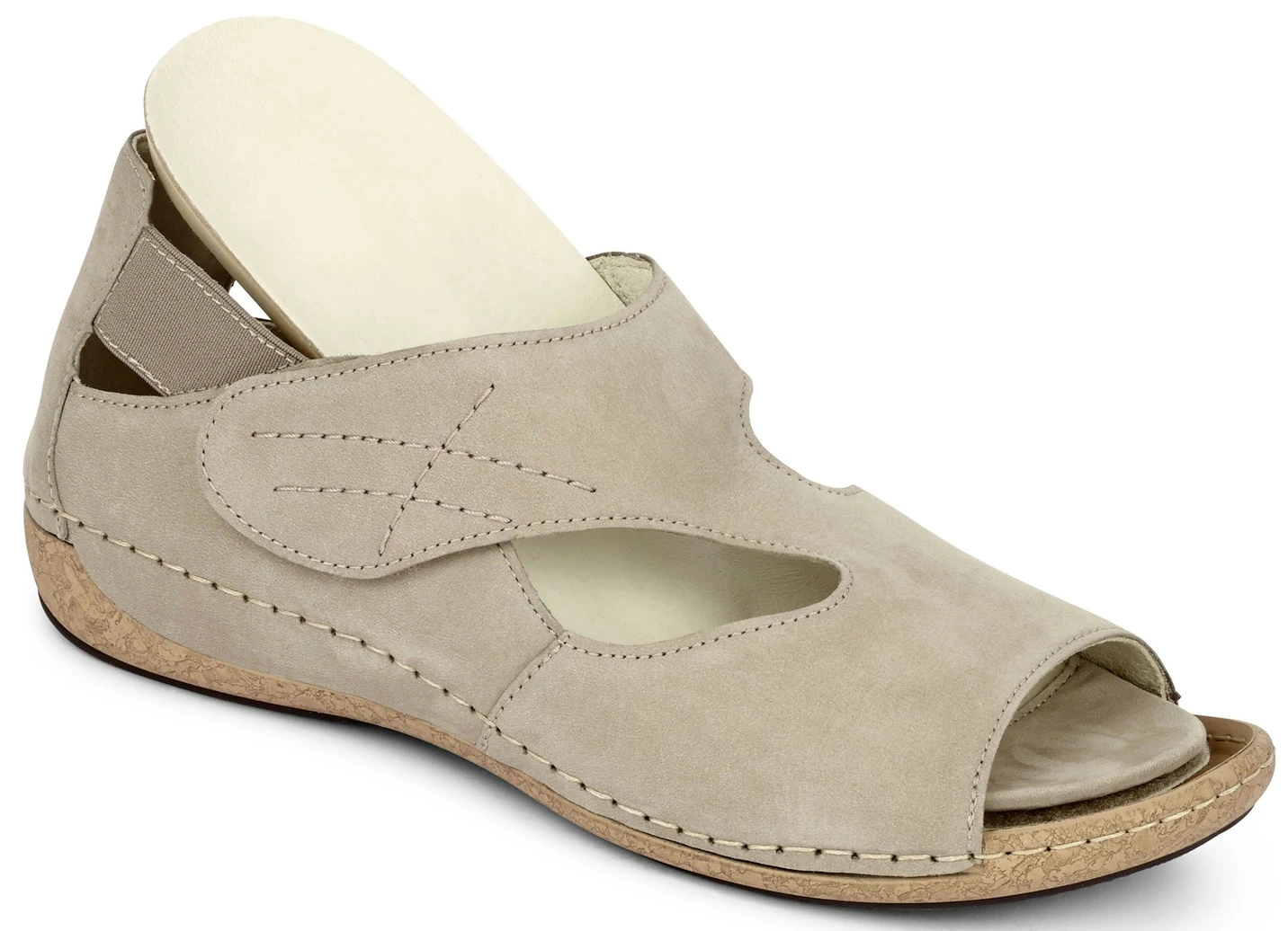 Hochwertige Sandale aus edlem Rind-Nubukleder: in Weite H, verstellbare Klettspange, Lederfutter, herausnehmbares Lederfußbett, leichte PU-Riffelsohle sowie 25 mm Keilabsatz
