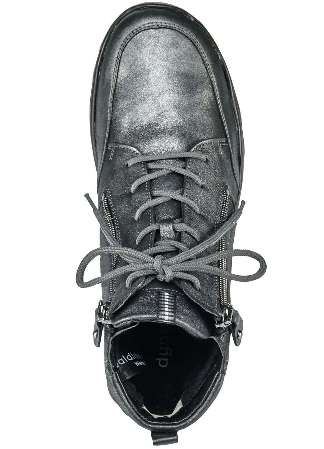 Schnür-Stiefelette aus genarbtem, gefettetem Kalb-Nubukleder, in Altsilber aus schattiert geprägtem Veloursleder: in Weite H, zwei seitliche Reißverschlüsse, Warmfutter aus 100% Baumwolle, herausnehmbares Fußbett, superleichte PU-Profilsohle mit bester Abrollfunktion und breiter Auftrittsfläche, daher Gelenk unterstützend, 30 mm Keilabsatz. Schafthöhe ca. 10 cm