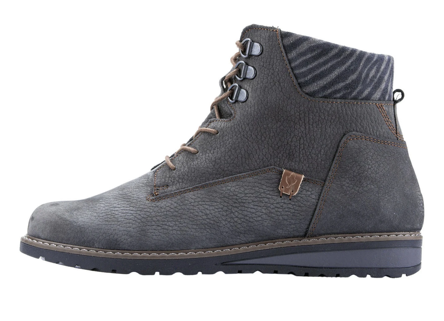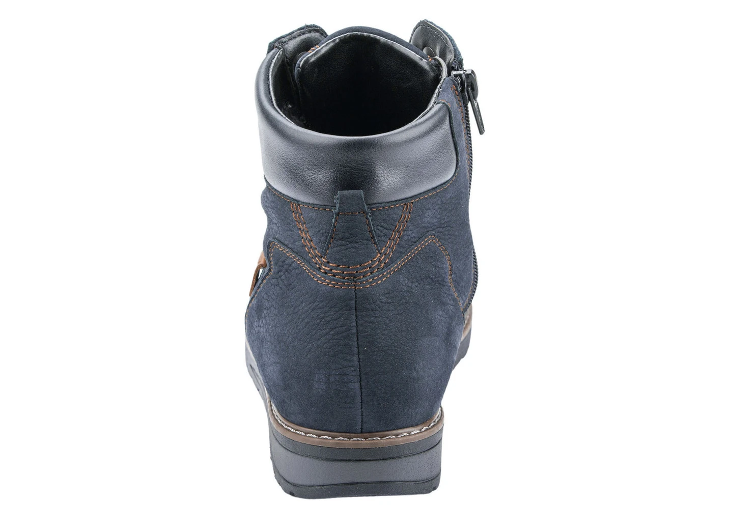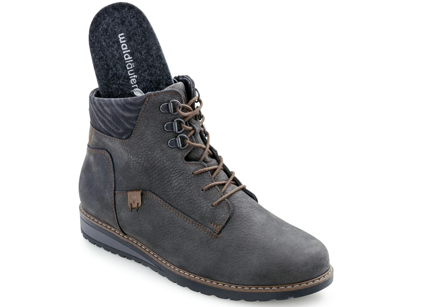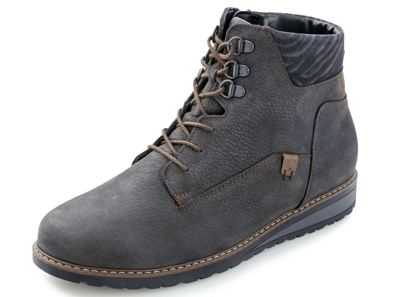 Schnür-Stiefelette aus genarbtem Rind-Nubukleder, mit gepolstertem, teilweise geprägtem Schaftrand: in Weite H, praktischer Innenreißverschluss, Warmfutter aus reiner Baumwolle, herausnehmbares Fußbett, leichte TR-Luftpolster-Profilsohle sowie 15 mm Keilabsatz. Schafthöhe ca. 13 cm